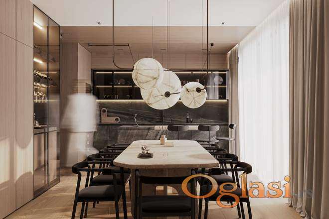 Po projektu renomiranog arhitektonskog studija urađeno je kompletno enterijersko opremanje, pa se stan prodaje potpuno namešten, modernim i vrhunskim materijalima i nameštajem. Stan je izuzetno svetao, dvostrano orijentisan, sa velikim staklenim površinama, visinom plafona 3,20 m, kvalitetnom unutrašnjom stolarijom, luksuznom granitnom keramikom u kuhinji i kupatilima, i ambijentalnom rasvetom. Kao takav, pruža izuzetan komfor i funkcionalnost za višelčanu porodicu.