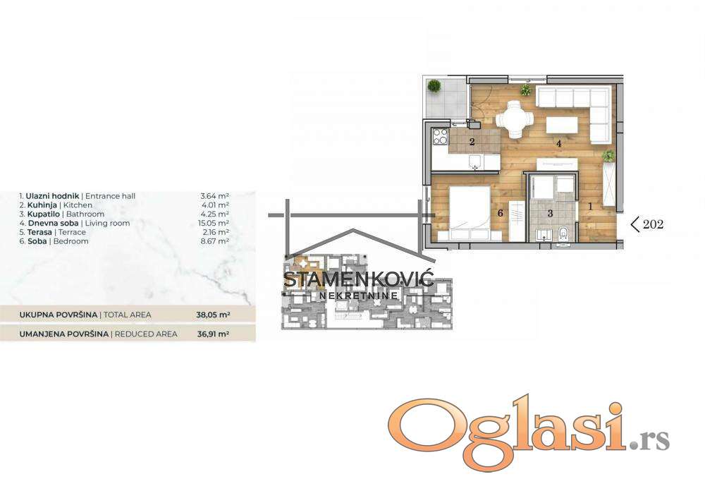 Stan je osmišljen za savremen način života, pružajući visok nivo udobnosti, funkcionalnosti i estetike. Svaka prostorija je pažljivo dizajnirana sa visokokvalitetnim materijalima i opremom, garantujući dugoročnu izdržljivost i luksuzan izgled.