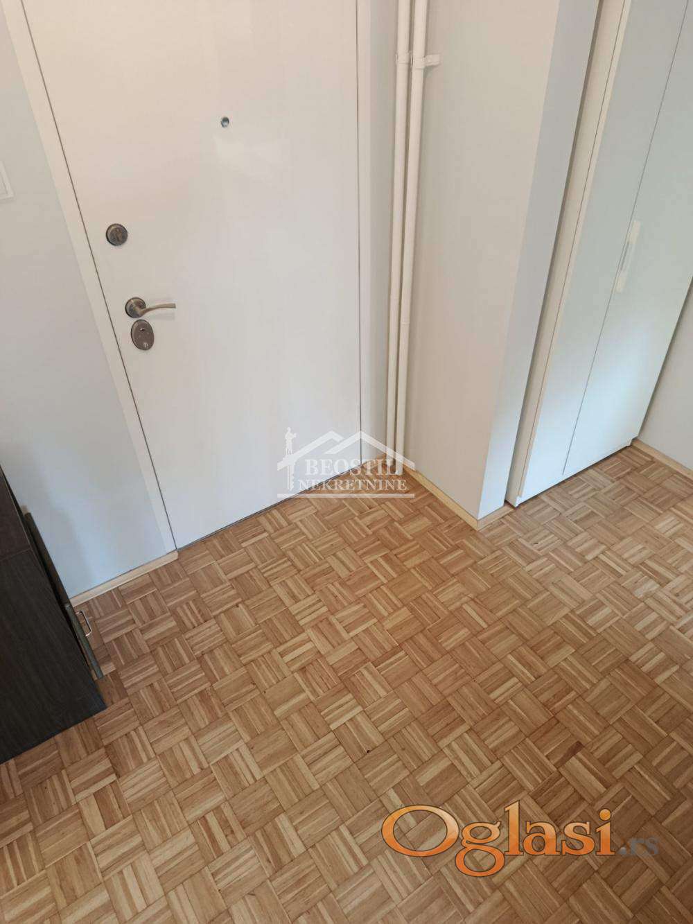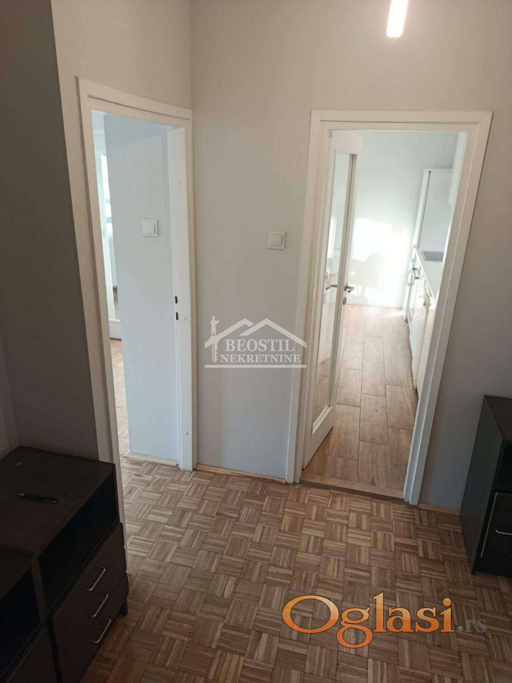 Iz ulaznog hodnika se dolazi do svih prostorija bez da su prolazne, desno kuhinja i trpezarija sa izlaskom na zastakljenu lođu pod 90' pravo dnevni boravak koji je povezan sa trpezarijom staklenim vratima, levo kupatilo sa mestom za veš mašinu i do istog je soba. Cela širina prostorija je u prozorima koje imaju roletne, zapadna strana. Parket lamelni ishoblovan, lakiran. Zamenjene vodovodne, kanalizacione cevi, struja, ulazna vrata.