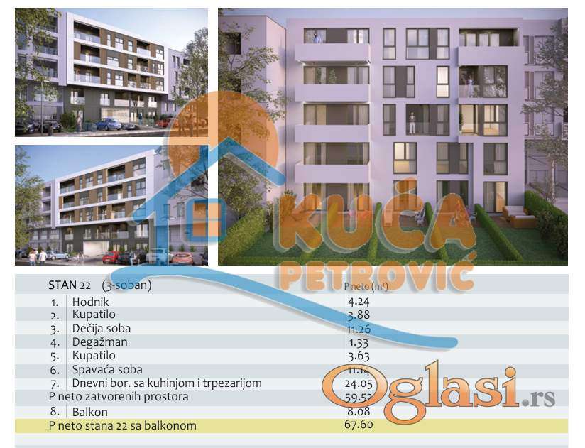 Na prodaju trosoban stan na III spratu zgrade u izgradnji u Čairu, na atraktivnoj, mirnoj i prestižnoj lokaciji. Izgradnja zgrade je po najsavremenijim standardima moderne gradnje, Po +Pr+G+3 gde će ceo lobi prostor biti u oblogama i enterijerski urađen a prednja strana fasade ventilisana od Swiss pearl ploča, sa video nadzorom i video interfonom. Stan se sastoji od ulaznog hodnika, dnevne sobe sa trpezarijom i kuhinjom, dve spavaće sobe, dva kupatila i balkona,a posebnim stepeništem se izlazi na dodatnu, sopstvenu terasu od 68 m2, kvalitetno hidro izolovanu sa deking podlogom, za kompletno uživanje u pogledu na čairski park. Na podovima je troslojni parket velikog formata sa visokim lajsnama, keramika velikog formata, ugrađen smart tanki bojler, u dnevnoj sobi inverter klima a grejanje centralno, sa kalorimetrima. Spoljašna stolarija je aluminijum - drvo sa tri stakla i punjena argonom, sa termoizolacionim roletnama na elektro pogon. Planirani završetak radova najkasnije 15.08.2027. Mogućnost kupovine garažnih parking mesta i povraćaja PDV -a za kupce prvog stana. Za više informacija pozovite agenciju.