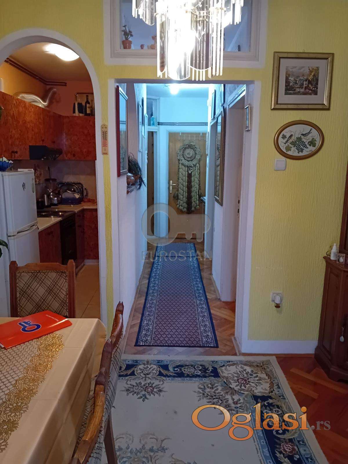 Prostorije: hodnik, dnevni boravak sa trpezarijom i odvojenom kuhinjom, dve spavaće sobe, kupatilo , ostava , lođa sa ostavom.