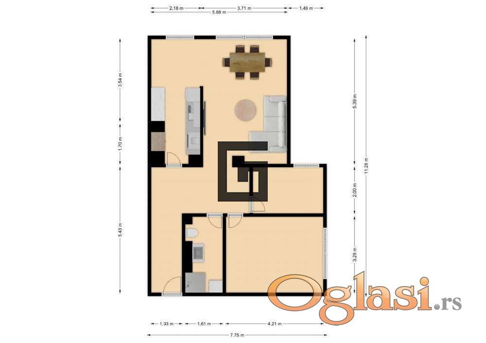 – prostrana dnevna soba sa kuhinjom i trpezarijom,