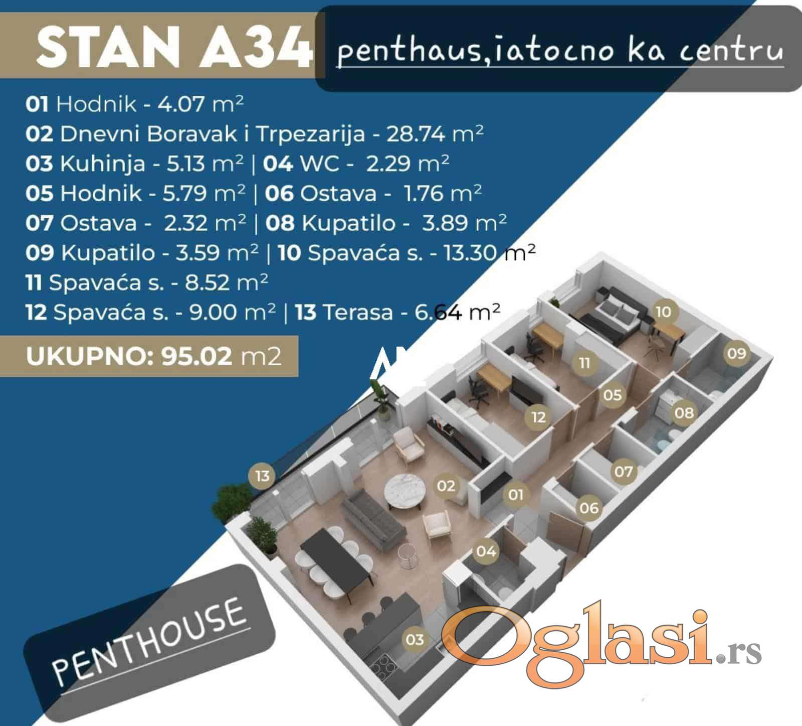 Odličan penthouse 4.0 u centru Stare Pazove. Stan se sastoji od: dnevnog boravka sa kuhinjom i trpezarijom, wc , terasa, i dve ostave, i odvojenog spavaćeg bloka sa tri sobe, i dva kupatila. Nalazi se u samom centru Stare Pazove, na 200m od svih potrebnih sadržaja. Zgrada je rađena od najmodernijih materijala i stan je odmah useljiv. Zgrada poseduje lift, EG, u sklopu zgrade i dečija igraonica. Agencijska provizija 2%. //Agent: 060/1691159//
