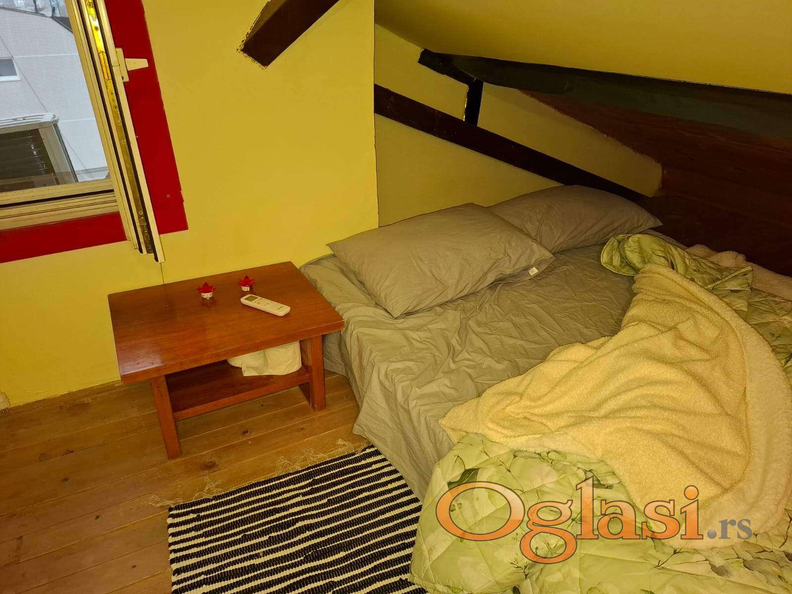 Izdajem duplex garsonjeru u centru Novog Sada. 5 minuta od Srpskog Narodnog pozorista i 5 minuta od Bulevara Osobodjenja. Stan je lep svetao cist namesten. Postoji nova klima , prozori su novi kao i sve u stanu. Odvojeni nivo iznad za spavanje i za orman kao odvojena prostorija. Donji deo sadrzi takodje veliki krevet koji se razvlaci za spavanje i kuhinju u sklopu dnevnog boravka.