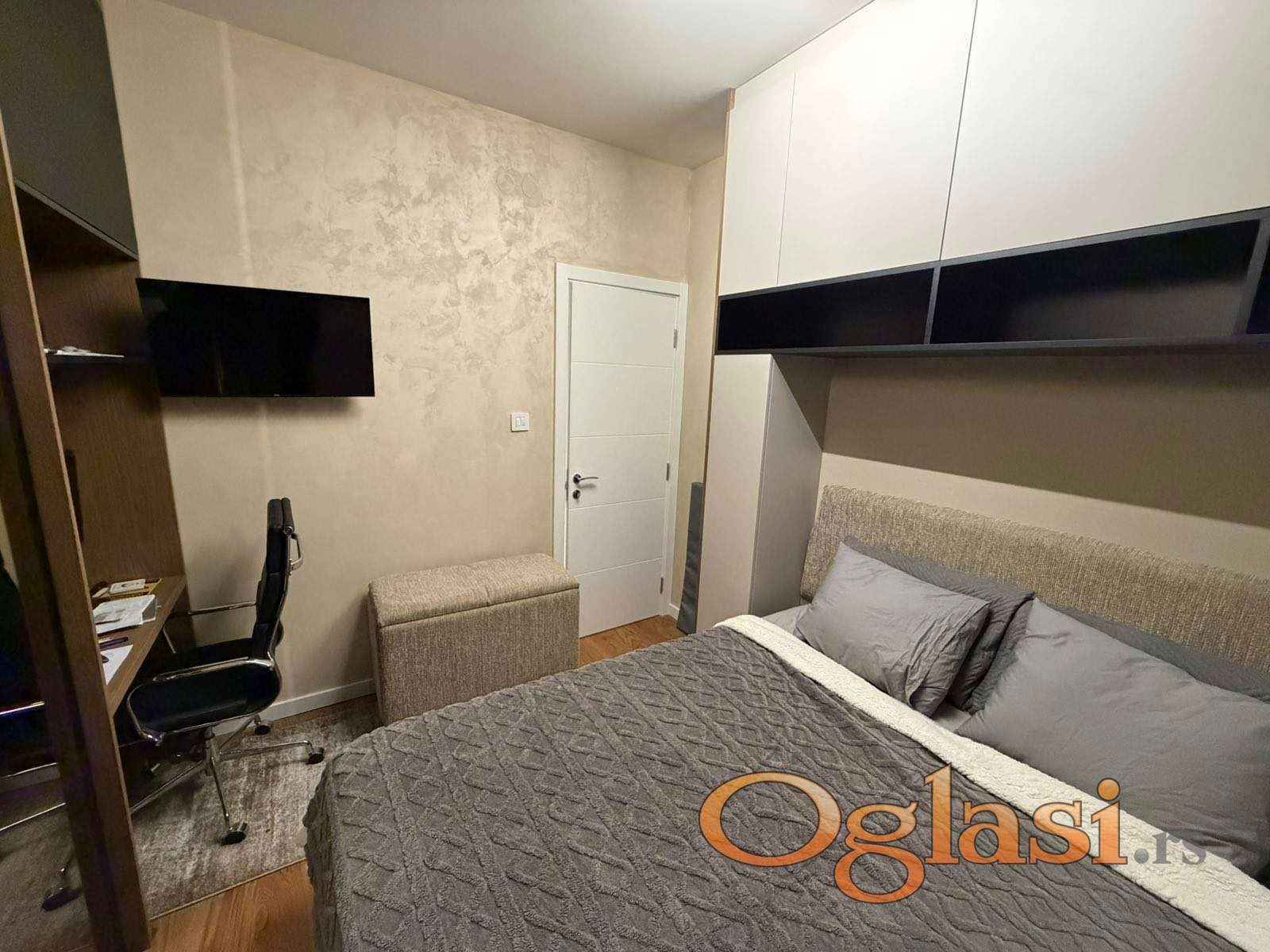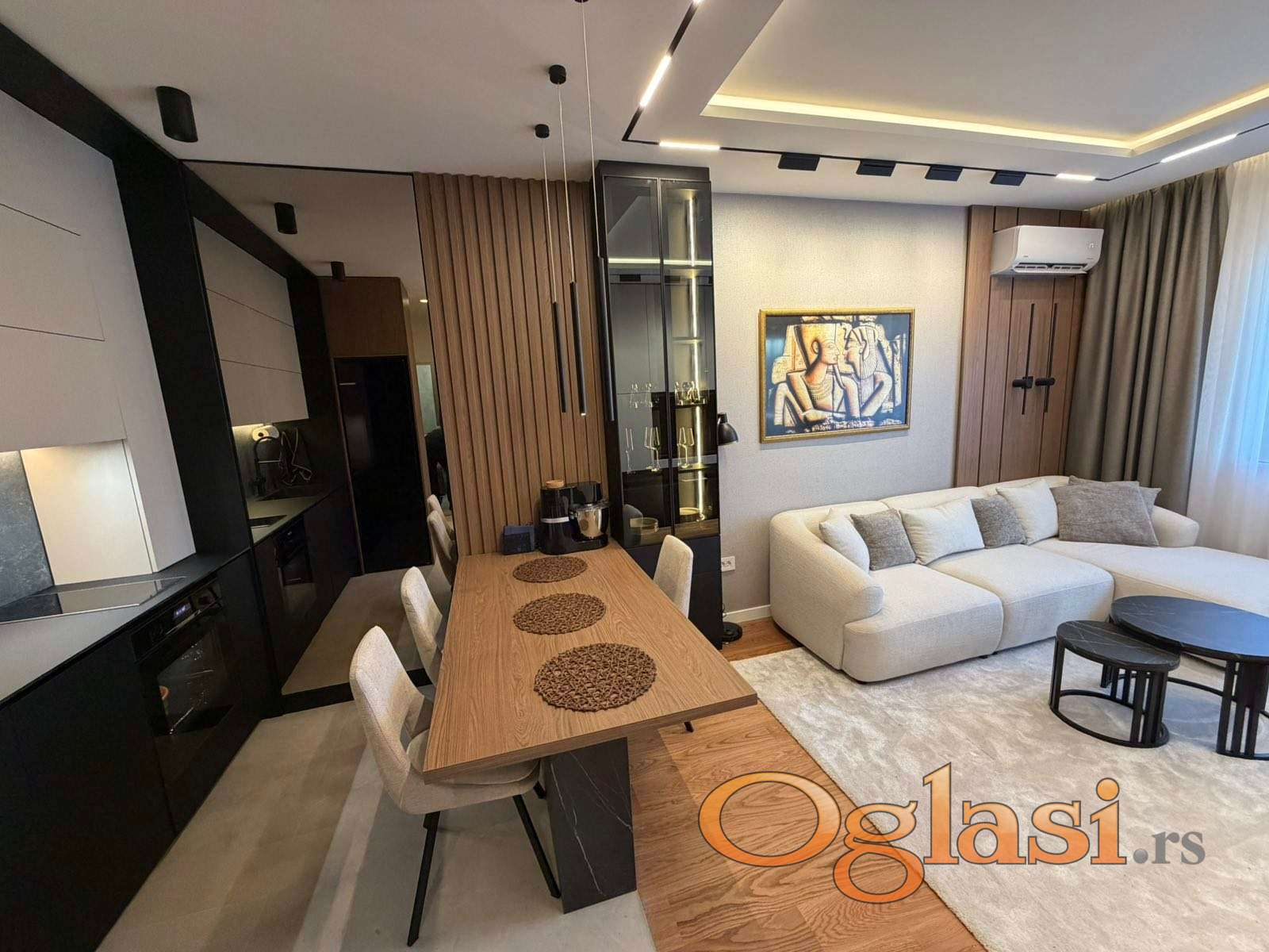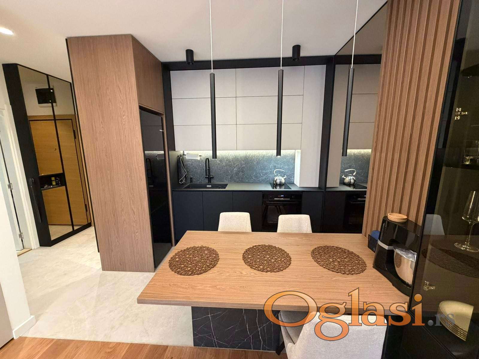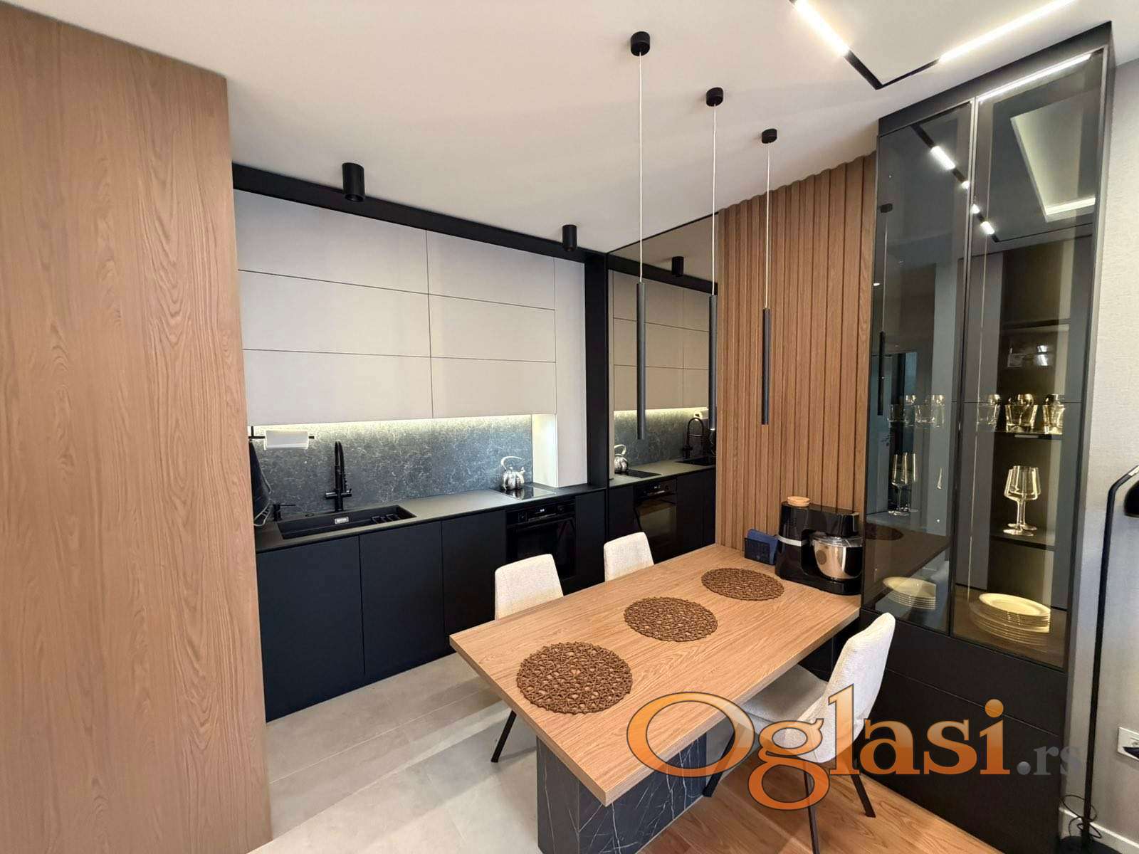 Enterijer odiše elegancijom i savremenim luksuzom – gotovo kompletna stolarija izrađena je od medijapana po meri, sa jasnim akcentom na praktičnost, dugotrajnost i besprekoran dizajn koji odgovara potrebama modernog načina života. Bela tehnika renomiranih proizvođača je pažljivo birana, potpuno nova i u garanciji, uz dodatno ugrađene filtere za prečišćavanje vode, što dodatno doprinosi komforu i kvalitetu stanovanja.