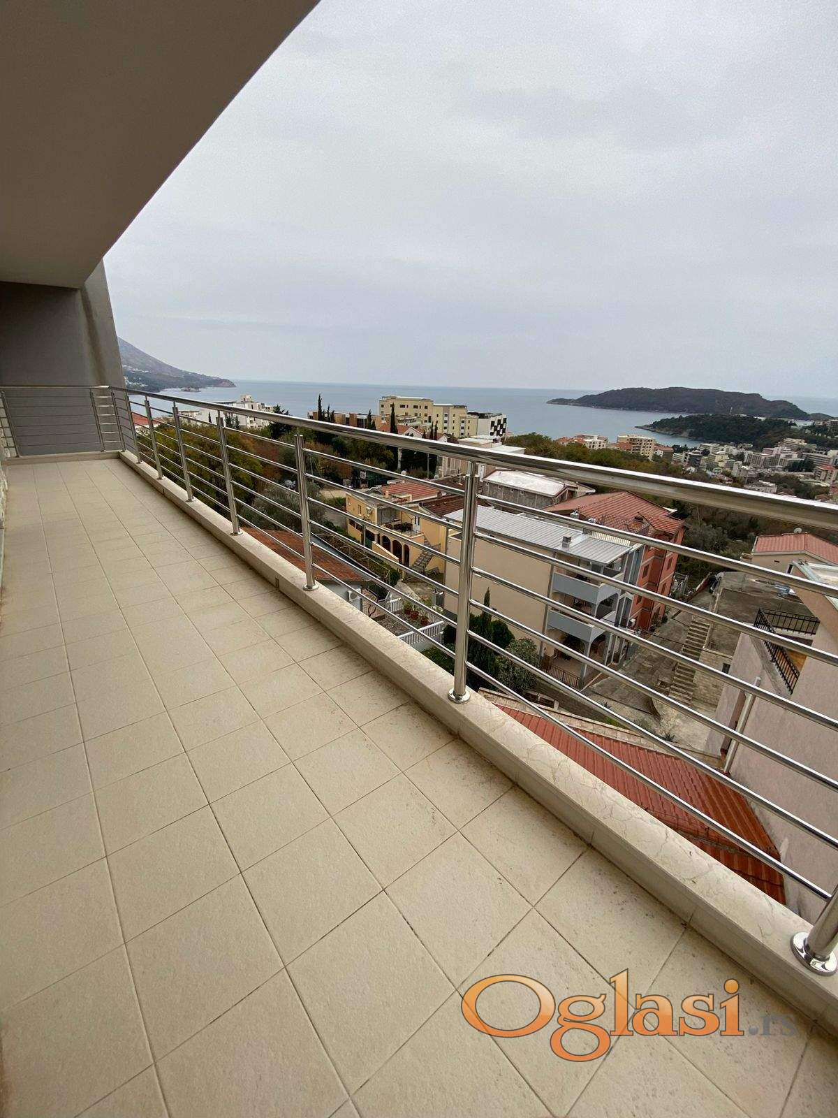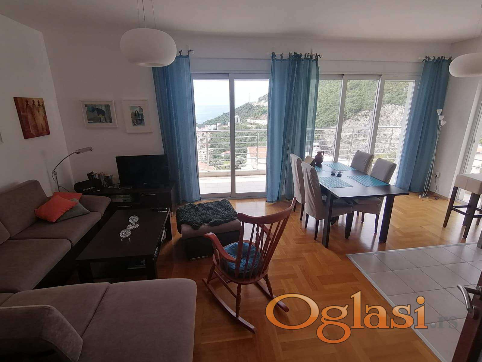 2 spavaće sobe, dnevni boravak, blagovaonica s kuhinjom, 2 kupaonice (svaka s kadom), hodnik, velika terasa. Izlaz na terasu iz spavaće sobe i dnevnog boravka. Pogled na more.