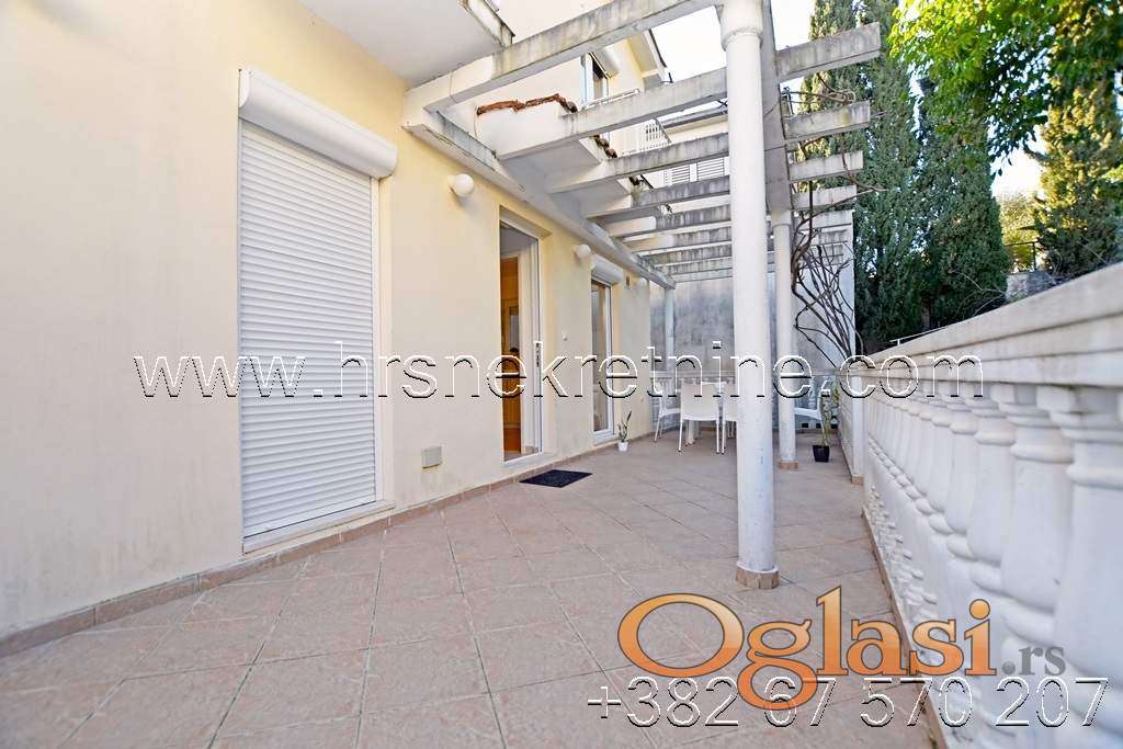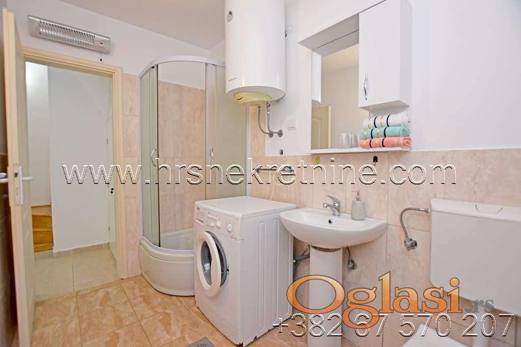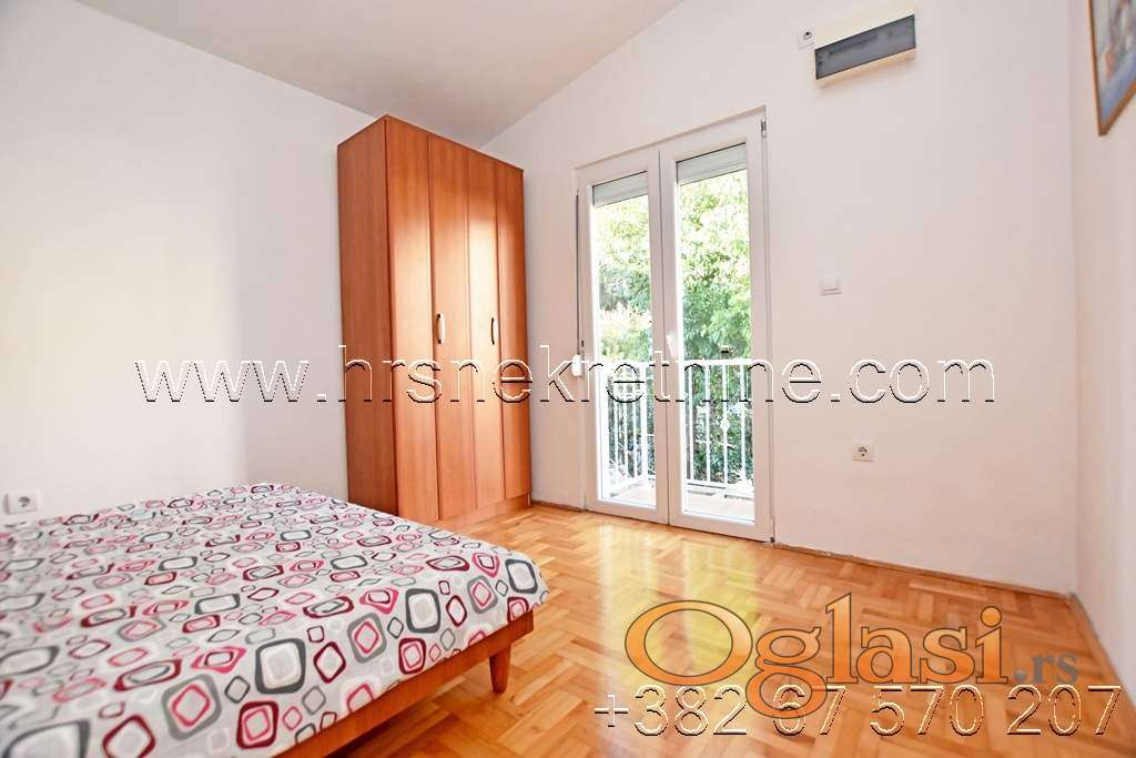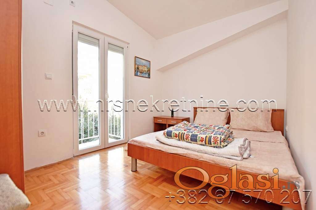 - Trosoban stan, opremljen dupleks sa rasporedom prostorija: prvi sprat-velika ulazna terasa sjeverno orjentisana savršena za odmor u toku ljetnjeg perioda, hodnik, kuhinja, dnevna soba i kupatilo; drugi sprat: tri spavaće sobe i kupatilo. Dnevni boravak i jedna spavaća soba imaju pogled na more. Površina stana je 72 m2 + terase.