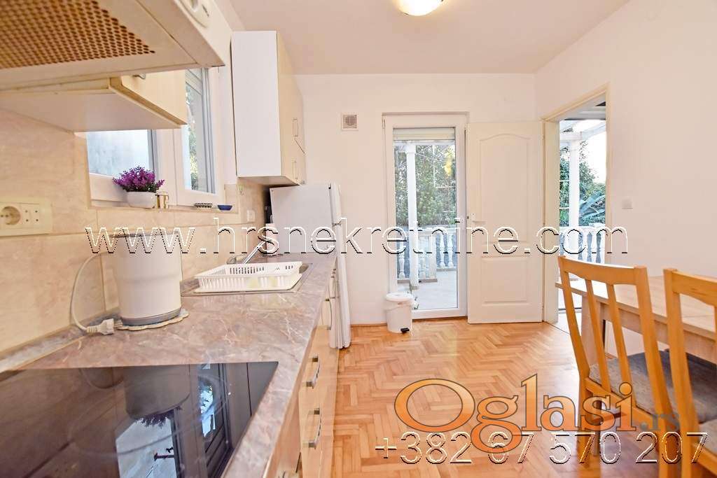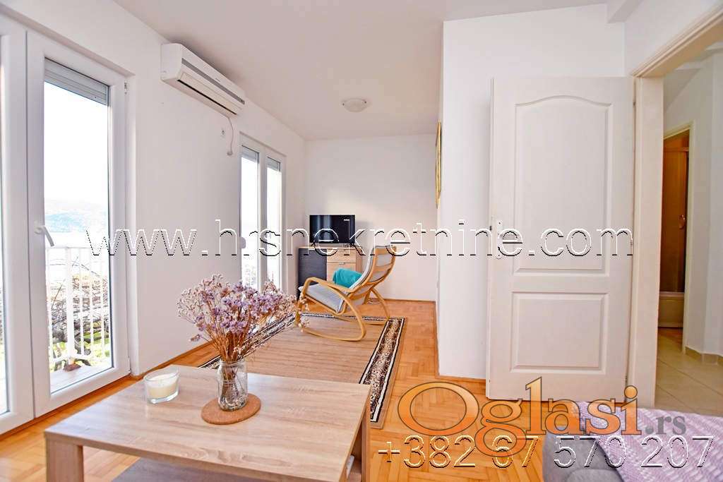 - Jednosoban stan, prizemlje , opremljen stan sa rasporedom prostorija: velika ulazna terasa sjeverno orjentisana, hodnik, kuhinja sa dnevnom sobom, spavaća soba i kupatilo. Dnevni boravak je sa boćnim pogledom na more. Površina stana je 34 m2.