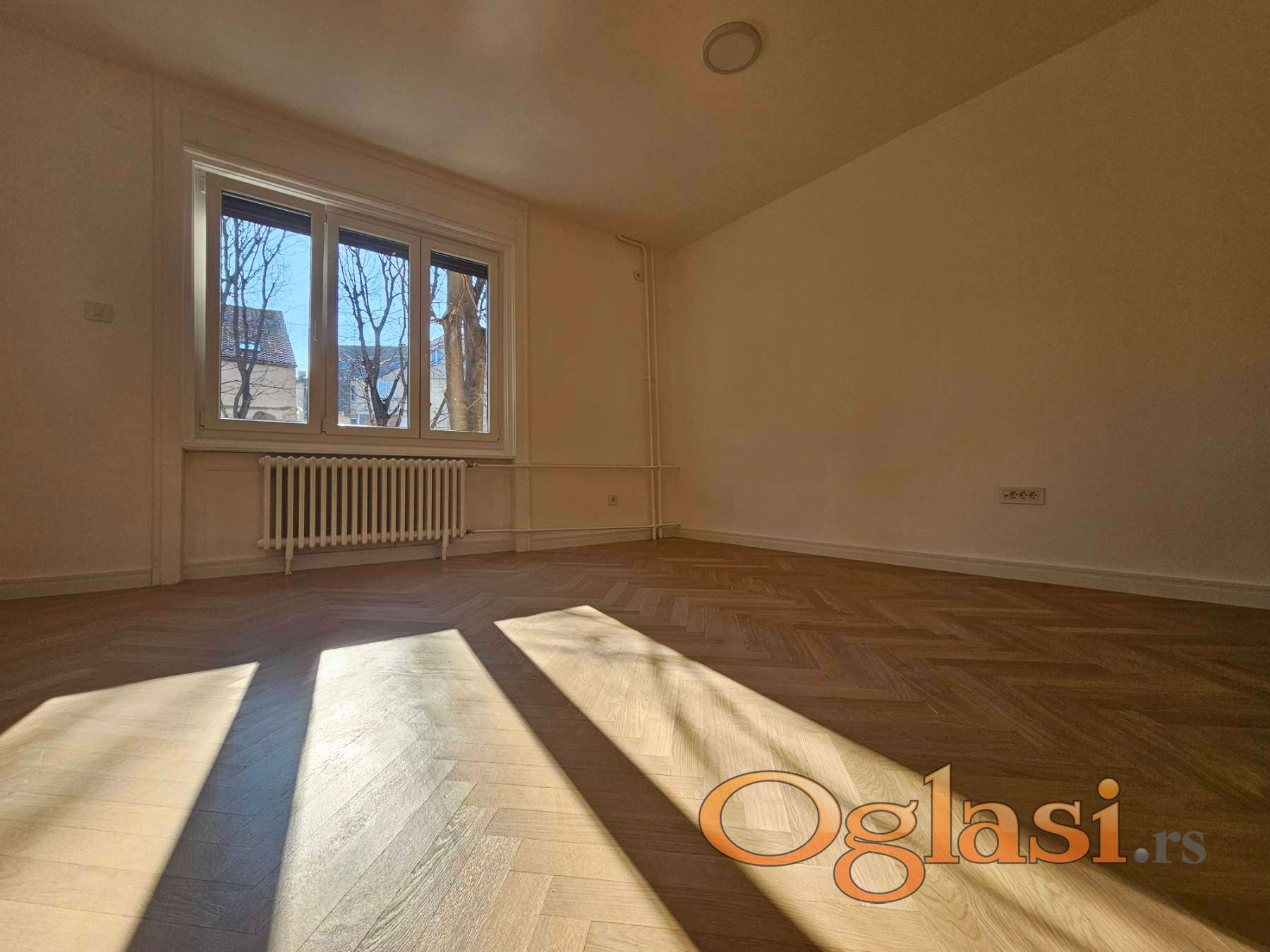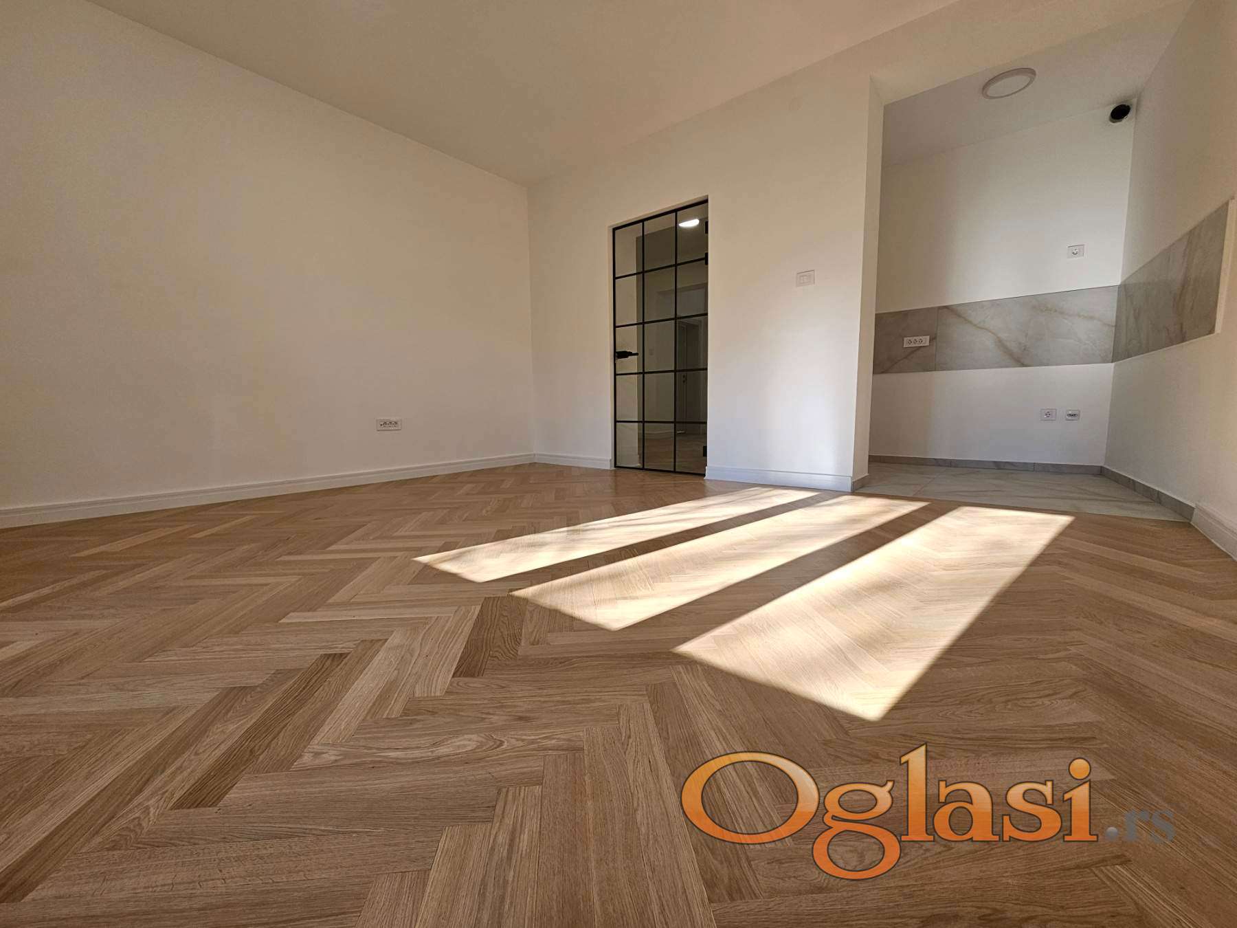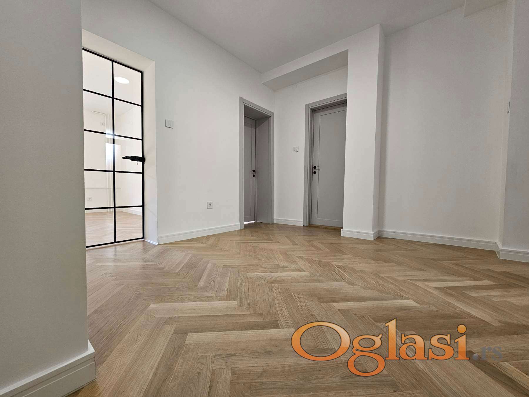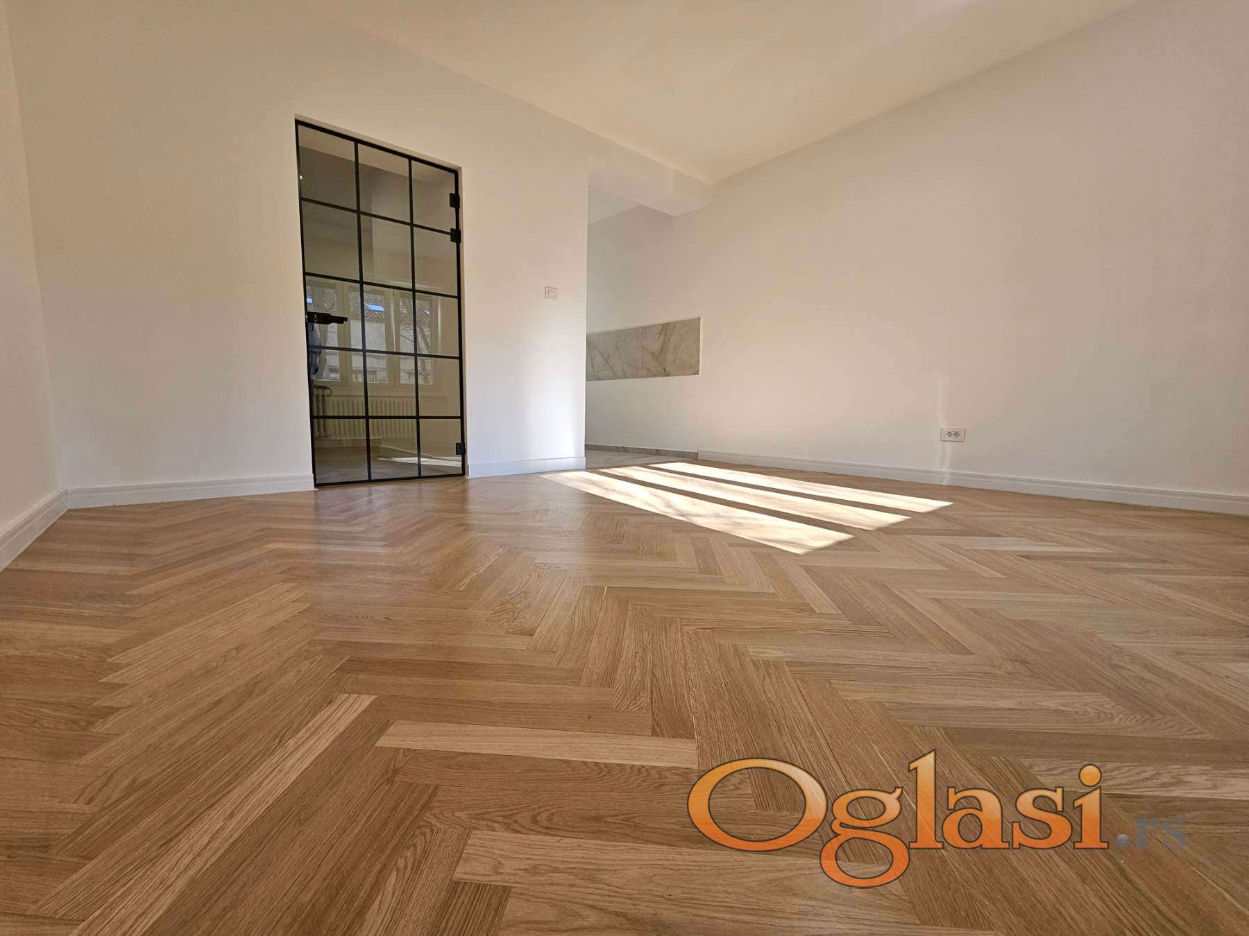 Podovi su u potpunosti novi – ispod parketa postavljene su nove OSB ploče, dok je hrastov parket prve klase, velikog formata, lakiran vodenim mat lakom. Enterijer je upotpunjen belim medijapan lajsnama visine 10 cm, koje prostoru daju elegantan i moderan izgled.