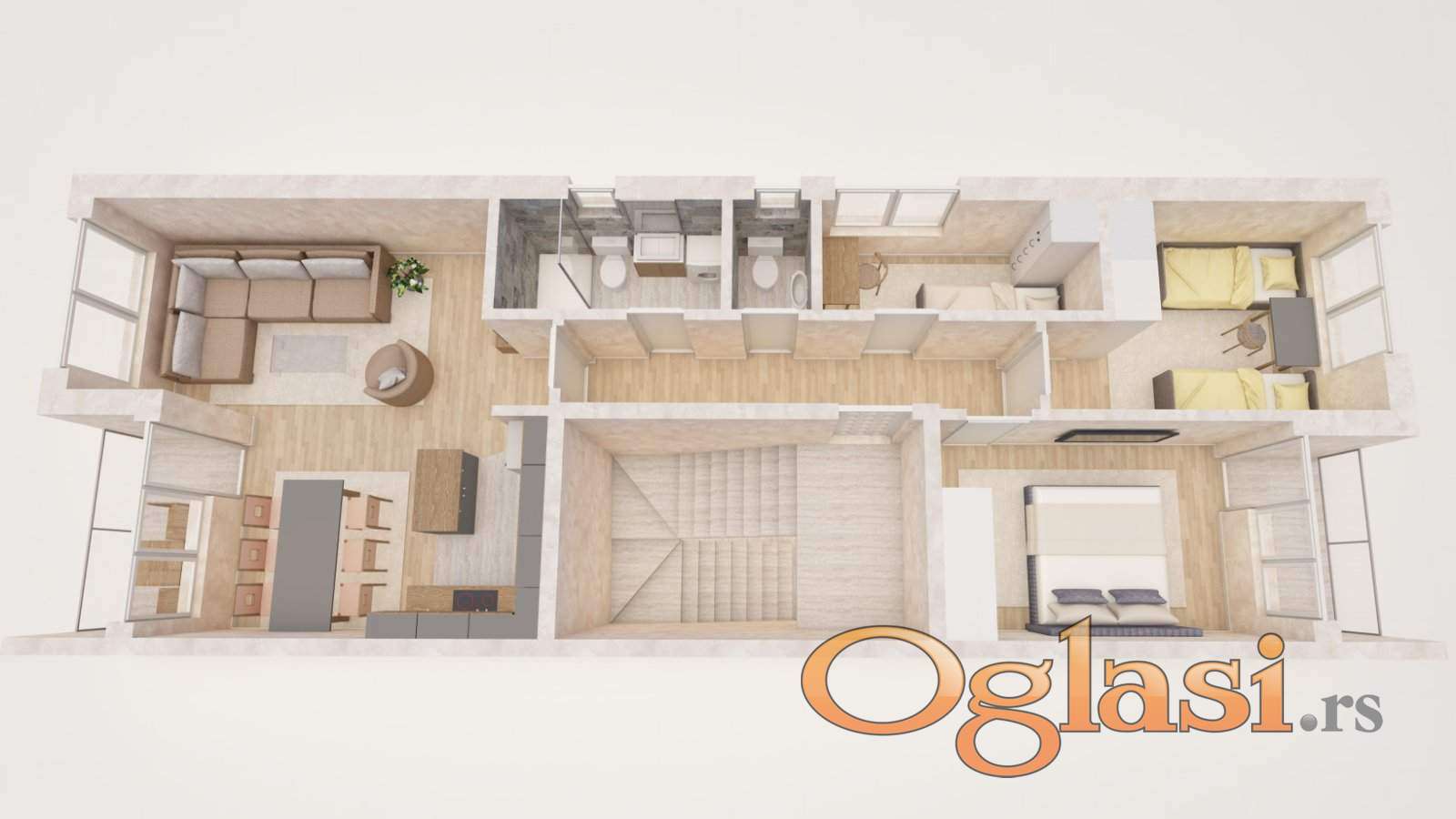 Ima sjajan raspored koji se sastoji od dnevnog boravka sa kuhinjom i trpezarijom u veoma osvetljenom (open space) prostoru, dve spavaće sobe, jedne radne sobe, kupatila, gostinjskog toaleta,  hodnika i dve terase. Kupcima je na raspolaganju i korišćenje tavanskog prostora od cca100m2 u potkrovlju.