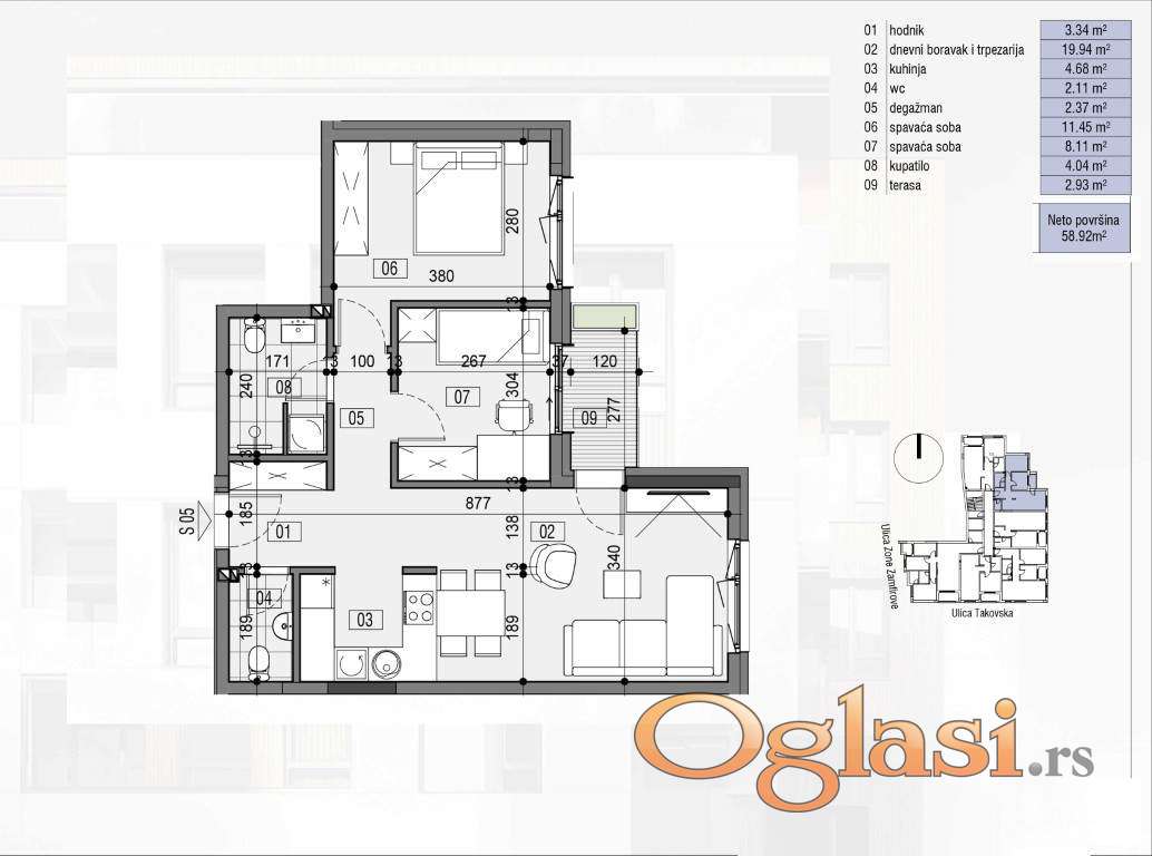 Prodaje se odličan funcionalan trosoban stan na Paliluli, udaljena 10 minuta laganim hodom od Kalče. Nalazi se u na prvom spratu stambene zgrade koja ima lift i koja će biti izgradjena po navišim standardima gradnje. Stan je površine 58.92m2. Sastoji se od ulaznog predsoblja, kupatila, dve izdvojene spavaće sobe, komforne dnevne sobe sa kuhinjom, trpezarijom i terasom. U stanu će kao glavni vid grejanja biti postavljeno podno grejanje sa električnim kotlom, biće postavljena inverter klima, vrhunska stolarija sa roletnama, na podu dolazi troslojni parket, pločice u kupatilu će biti prve klase i velikog formata. Stanovi se prodaju direktno od investitora koji je u sistemu PDV-a pa kupci prve nekretnine mogu tražiti povrat pdv-a od države. Kupovina bez provizije ka kupcu. Rok završetka kraj 2027 godine. Za više informacija pozovite.
