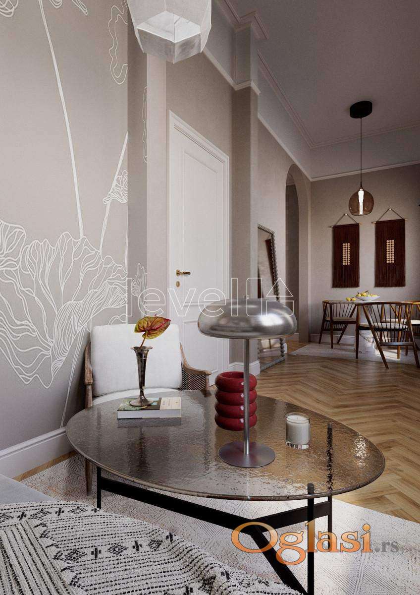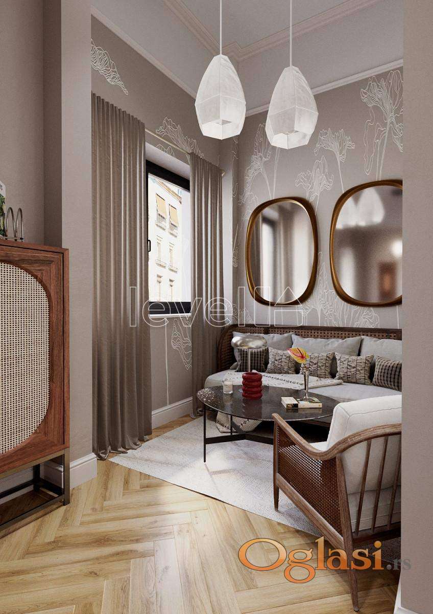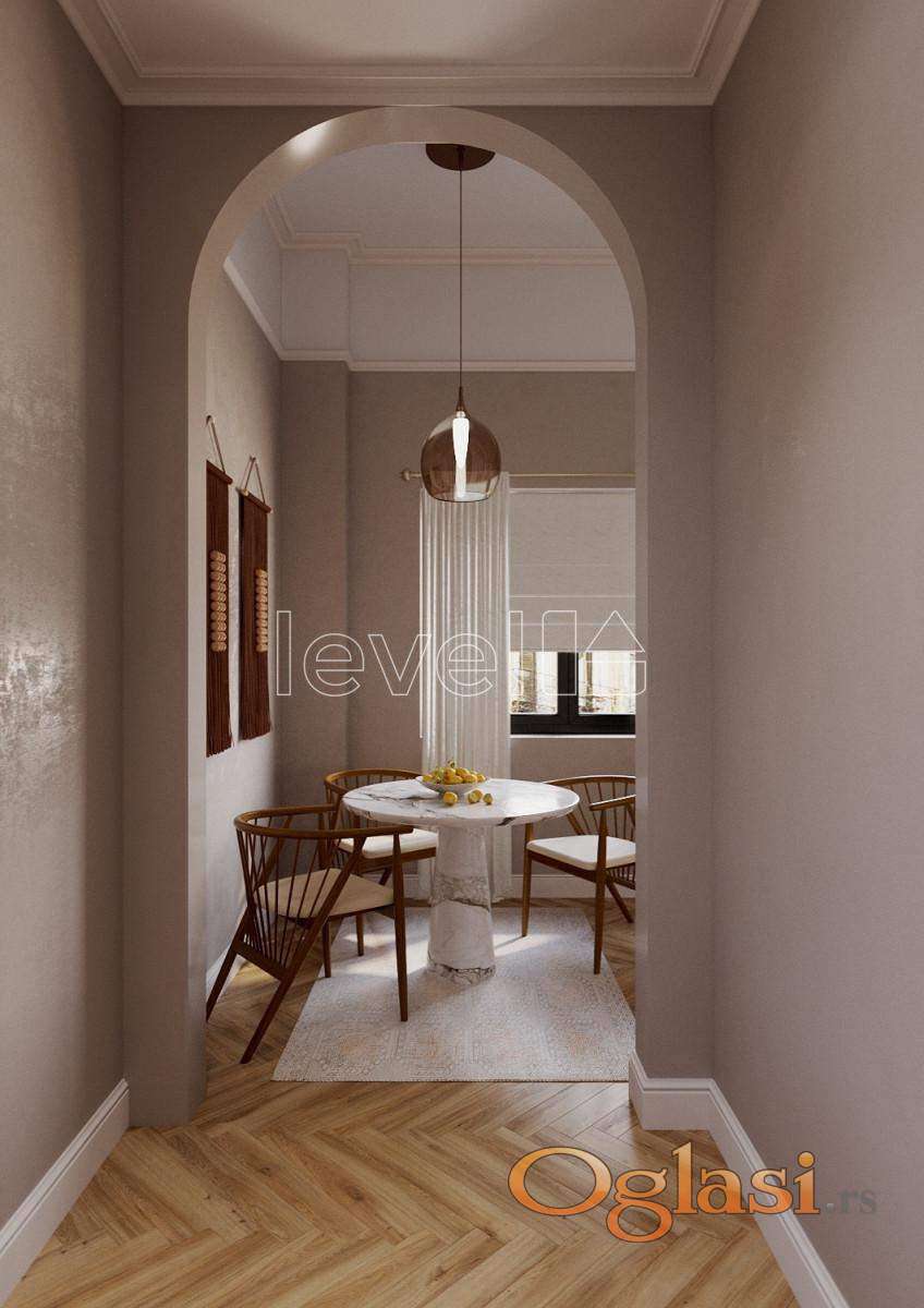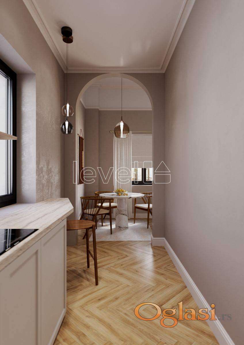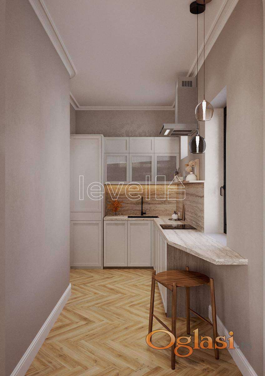 LEVEL PROPERTY, agencija za nekretnine Vam predstavlja dvoetažni salonski stan površine 46 m² u centru Novog Sada na prvom spratu stambene zgrade. Prostor se sastoji od salonskog prizemlja sa visinom plafona od 3,7 metara i mansarde visine preko 4 metra. Na prvoj etaži se nalaze prostrana kuhinja sa trpezarijom, dnevna soba i kupatilo. Na mansardi je smeštena spavaća soba sa prostranim garderoberom. Dvorišno je orijentisan. Za renoviranje se koriste najkvalitetniji završni materijali i savremeni inženjerski sistemi. Planirana je rekonstrukcija mansarde sa potpunom zamenom krova, duplom toplotnom izolacijom, hidroizolacijom i parnom branom, kao i novom stolarijom. Biće ugrađen sistem za dovod i odvod svežeg vazduha, kao i „pametna kuća” automatizacija. U unutrašnjem dvorištu kuće nalazi se privatni zeleni kutak, gde je sačuvana istorijska terasa sa kolonadom, iz koje vodi privatno stepenište direktno u stan. Završetak radova je planiran za četvrti kvartal 2026. godine. Za više informacija pozovite