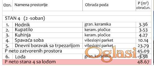 U ponudi je moderan stambeni objekat prilagođen savremenom načinu života porodice u Duvaništu. Prodaje se dvosoban stan, površine 48,67m2, na II spratu stambene zgrade sa Belkom bešumni liftom. Sastoji se iz ulaznog hodnika, dnevnog boravka sa trpezarijom, odvojene kuhinje, spavaće sobe, kupatila i terase. U gradnji se koriste najkvalitetniji materijali: Zidanje termo energetskim “Strong” blokom koji ima odlučnu zvučnu i toplotnu izolaciju, kao i odličnu mikroklimu, aluminijumska stolarija punjena argonom, 4S stakla, inverter klime grejanje+hlađenje sa spoljnim grejačem, instalacija po podu za etažno grejanje ili norveški radijatori (podno grejanje uz doplatu), sigurnosna-protivpožarna vrata, sobna vrata sa zvučnom izolacijom (magnetne brave), tarket-parket I klase višeslojni, granitna italijanska keramika Premium klase, protivklizna na terasama, sanitarije i tuš sistemi vrhunskog kvaliteta (walk-in tuš, kaljeno staklo, Rosan ventili), geberit sistem (ugradne wc šolje). Zgrada poseduje video nadzor, smart sistem (kao doplata), uz stan se dobija i ostava. Postoji mogućnost kupovine parking mesta. Nalazi se u mirnijem delu naselja Duvanište i predstavlja pravo mesto za Vaš kvalitetan i komforan porodičan život. U cenu je uključen PDV i kupci prvog stana imaju pravo na povraćaj PDV-a u iznosu od 10%. Hvala Vam što ste pogledali oglas. Za više informacija o ovoj ili drugim nekretninama i zakazivanje razgledanja kontaktirajte agenta na broj telefona iz oglasa (poziv, sms, viber) ili putem e-maila. Kompletnu ponudu dostupnih nekretnina možete pronaći na našem sajtu. Agencija Proagent nekretnine je upisana u Registru posrednika pod brojem: 940.