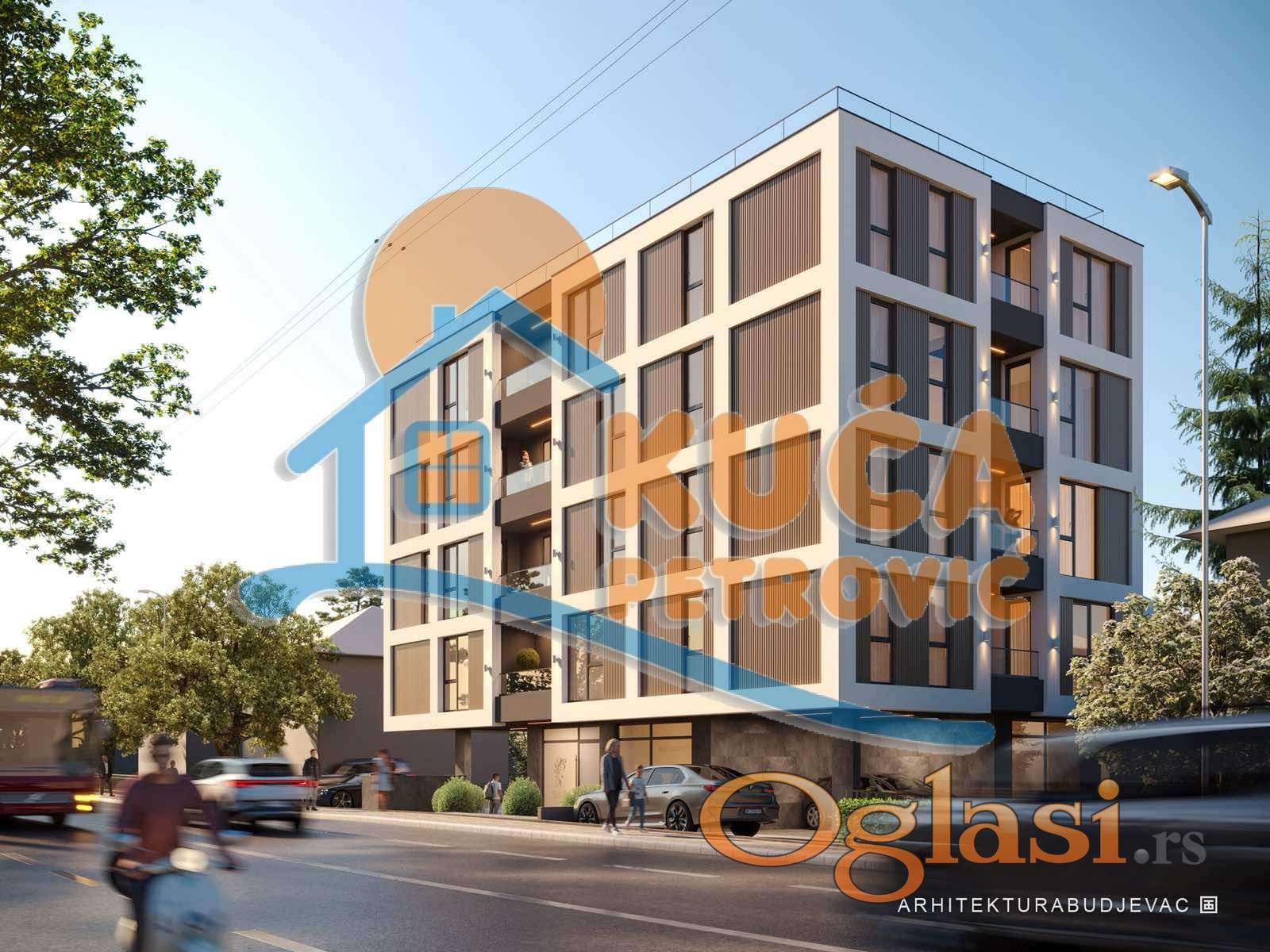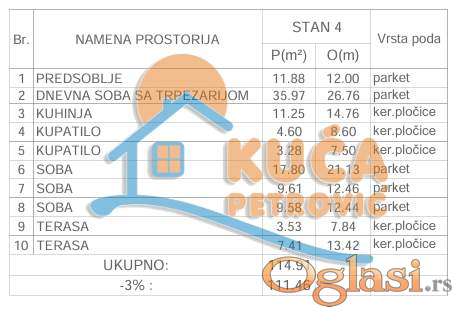 Na prodaju stan u novogradnji u blizini Rode, projektovane površine 115 Mm2. Nalazi se na jednoj od najpopularnijih lokacija za porodični život zbog blizine škole, vrtića i svih potrebnih infrastrukturnih objekata. Sastoji se od ulaznog hodnika, dnevnog boravka sa trpezarijom, kuhinje, tri spavaće sobe,dva kupatila i dve terase.Stambeno-poslovni objekat je P+4, izgrađen po svim savremenim standardima, Spoljašnja stolarija je PVC sa roletnama sa elektropodizačima,unutrašnja od medijapana sa sigurnosnim ulaznim vratima. Na podovima je troslojni tarket parket dok je keramika u kuhinji i kupatilu velikih dimenzija, prve klase.Spoljašnja izolacija je 10cm debljine, na podovima i između stanova postoji zvučna izolacija. Grejanje je etažno sa kotlom na struju i ugrađenim grejnim telima. Svakom stanu pripada ostava u podrumu zgrade dok se parking mesto dodatno naplaćuje. Moguća je kupovina putem stambenog kredita. Za kupce prvog stana postoji povrat PDV-a. Rok završetka je septembar 2027. godine. Ovo je samo deo naše ponude. Za više informacija, stojimo vam na raspolaganju.