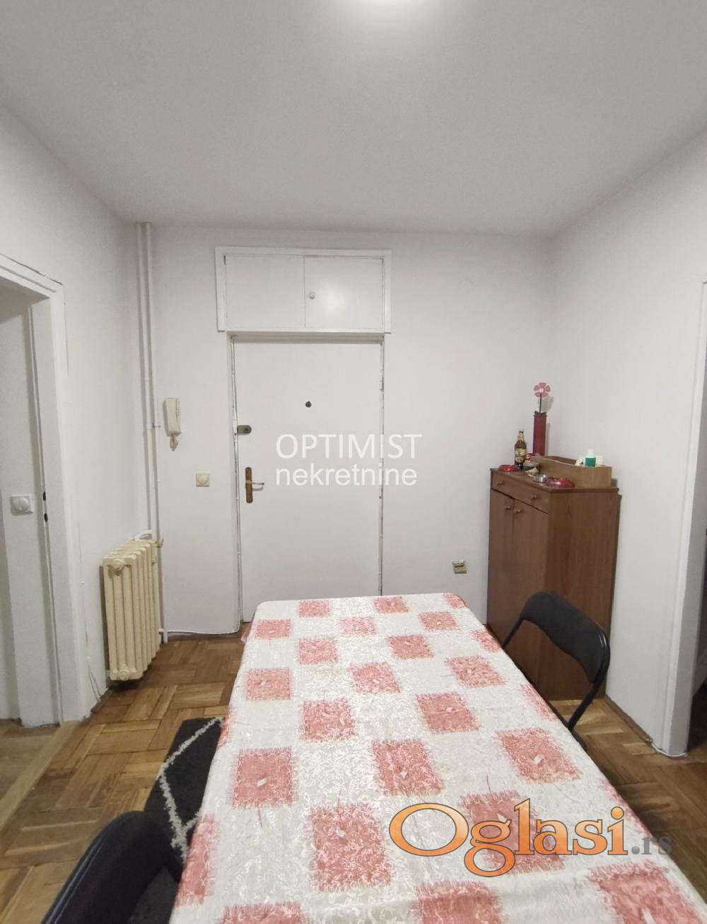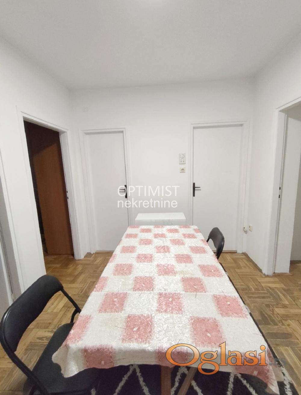 Prostorije: prostrano predsoblje, dnevni boravak, dve spavaće sobe, kuhinja i trpezarija, ostava, kupatilo i terasa. U sve prostorije se ulazi iz predsoblja. Stanu pripada i podrum. Grejanje je centralno. Infostan 9500 dinara.