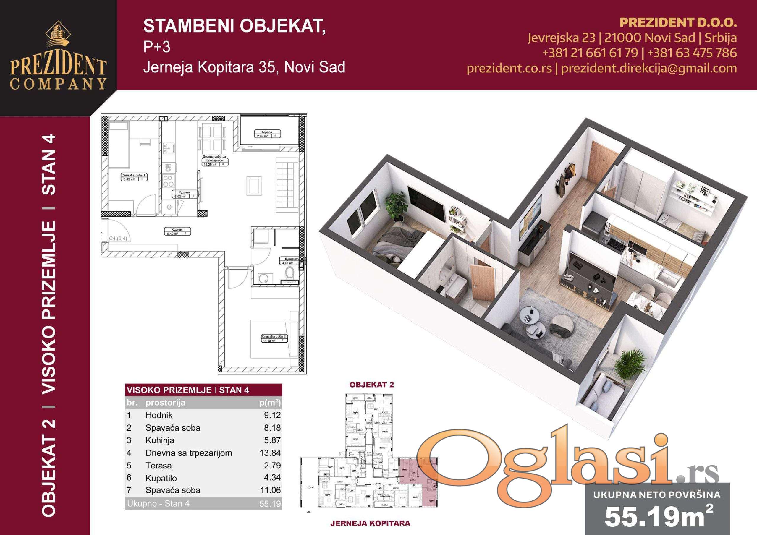Prodajem stan 55m2 na visokom prizemlju (visina prvog sprata) u ulici Jerneja Kopitara 35. Stan u izgradnji sa 2 izdvojene spavace sobe.