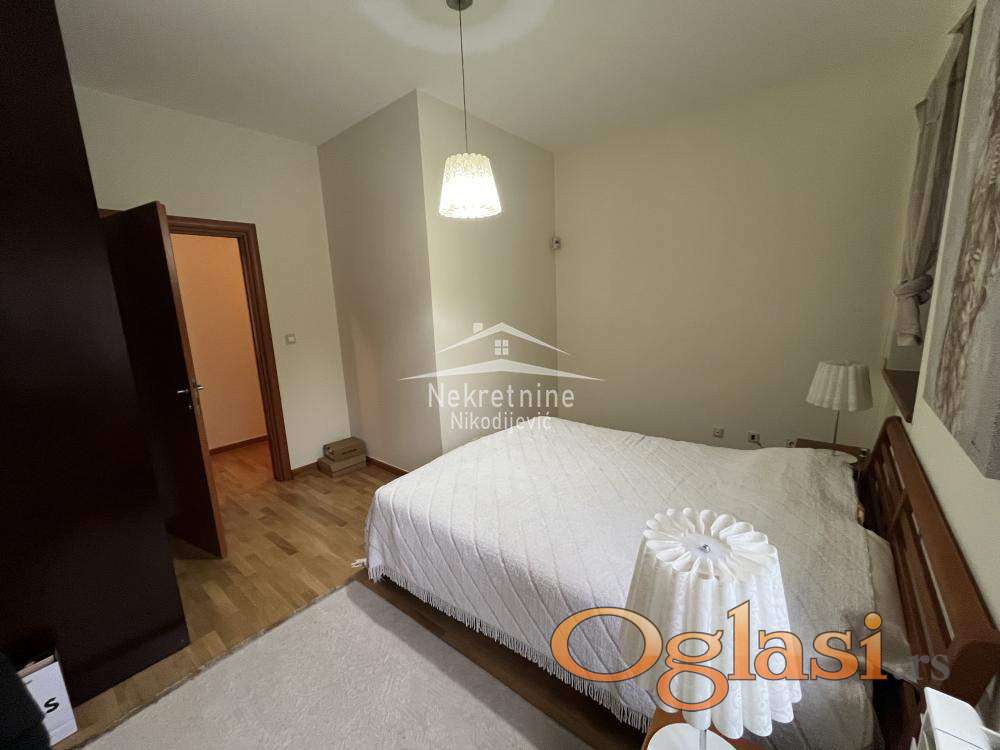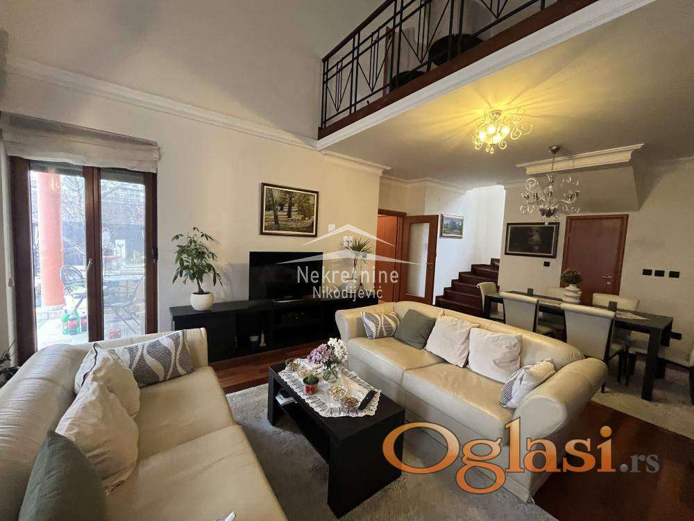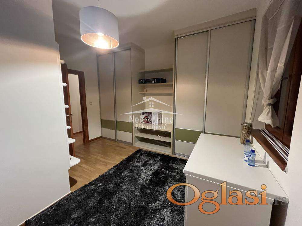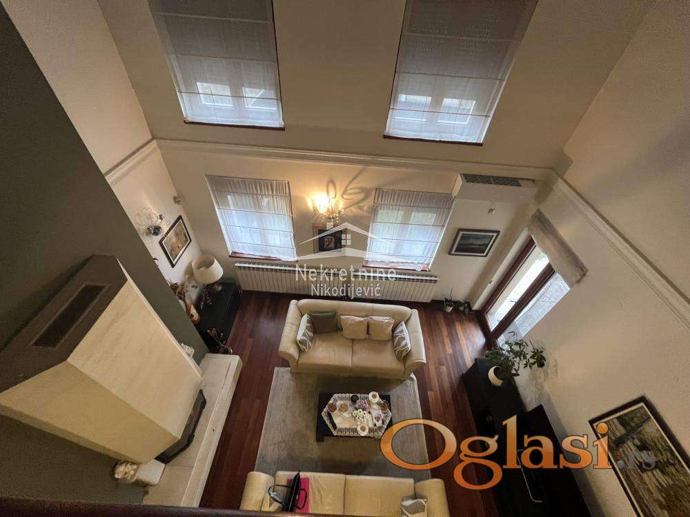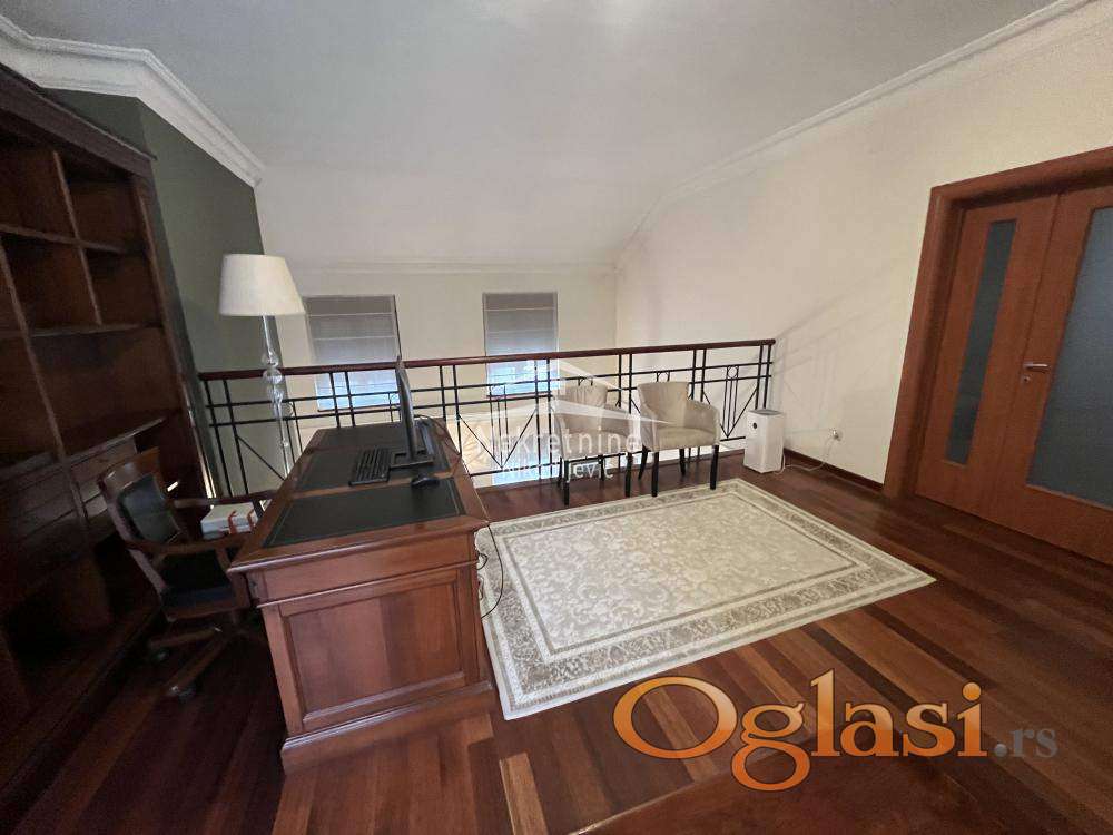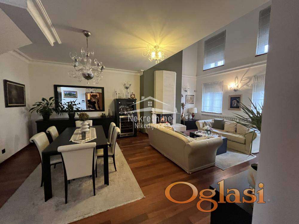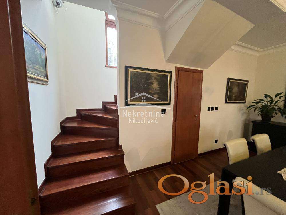 Stan na prestižnoj lokaciji. Nekretnina se vodi kao stan ali je zapravo kuća sa okućnicom i bazenom. Grejna površina nekretnine je 220m2, a zapravo ima oko 290m2. U kvadraturu nisu ušle terase, 2 garažna mesta, ostava i dr. Nekretnina se sastoji od: ulaznog hola, antrea, velikog dnevnog boravka sa kaminom visine preko 6 metara, kuhinje sa trpezarijom, 5 spavaćih soba, 3 terase, 3 kupatila, dvorišta sa bazenom, ostava i 2 garažna mesta. Objekat odlišno održavan, bez ulaganja. Uredna dokumentacija, moguća kupovina iz kredita.