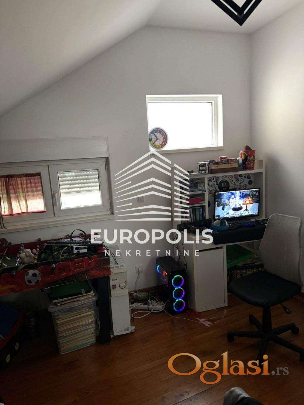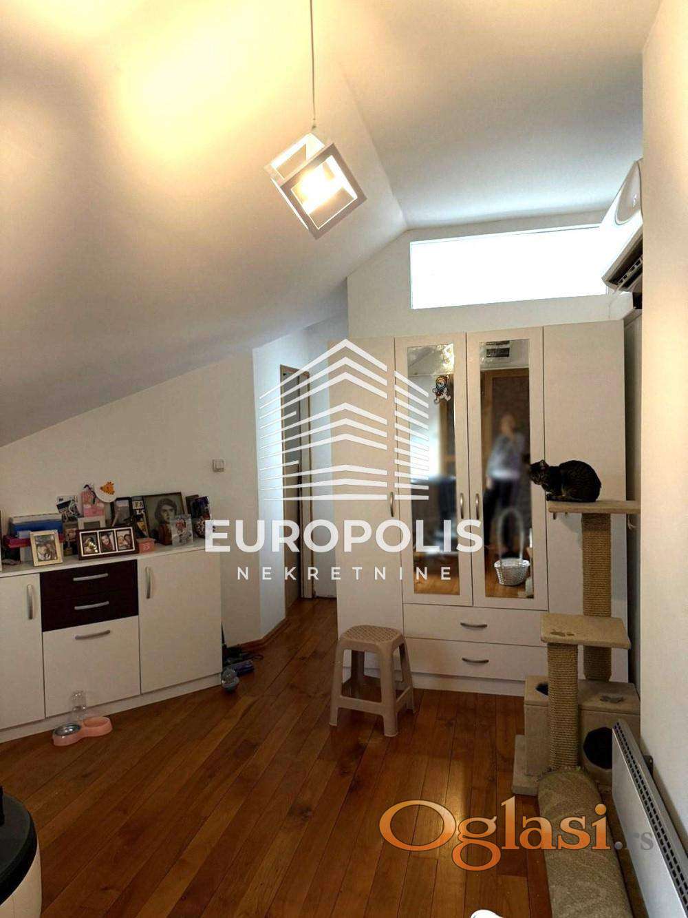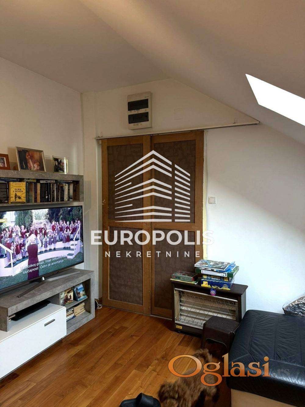 Stan je delimično u potkrovlju – jedan deo prostora je pod kosinama, dok je drugi deo sa punom visinom plafona, što daje posebnu dinamiku enterijeru i osećaj autentičnosti.