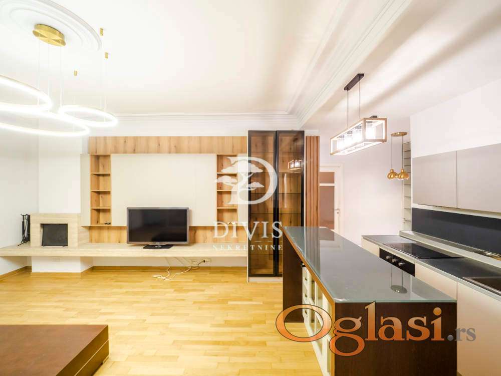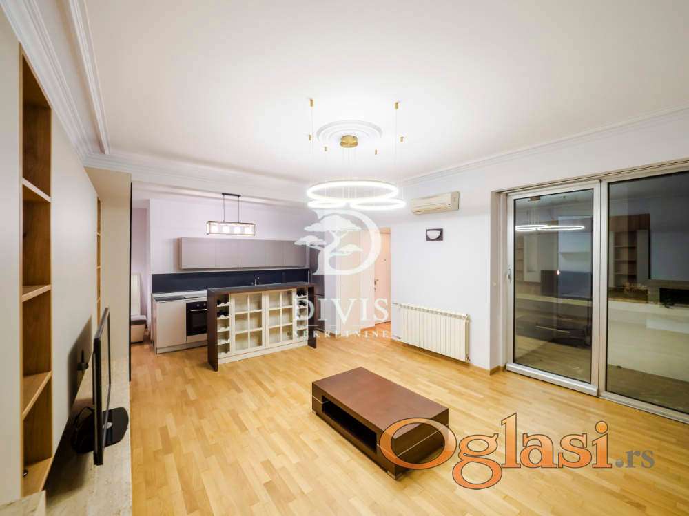 Nalazi se na prvom spratu, dvostrano je orijentisan sa dosta prirodne svetlosti. Sastoji se od ulaznog hodnika iz koga se desno ulazi u master spavaću sobu sa kupatilom I izlazom na terasu dvorišno orijentisanu, dok se sa leve strane nalazi dnevni boravak i kuninja (openspace koncept), posebno odvojen blok hodnik, još dve spavaće sobe, terasa i kupatilo. Stan je očuvan, delimično renoviran, prodaje se sa svim ugradnim elementima, veoma funkcionalan i može se podeliti na dve stambene jedinice.