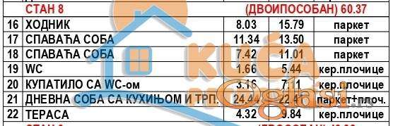 Stan je projektovane površine 60,37m2, nalazi se na prvom spratu. Po strukturi je dvoiposoban i sastoji se od ulaznog hodnika, dnevne sobe, trpezarije sa delom za kuhinju, dve spavaće sobe, kupatila, zasebnog sanitarnog čvora i prostrane terase.