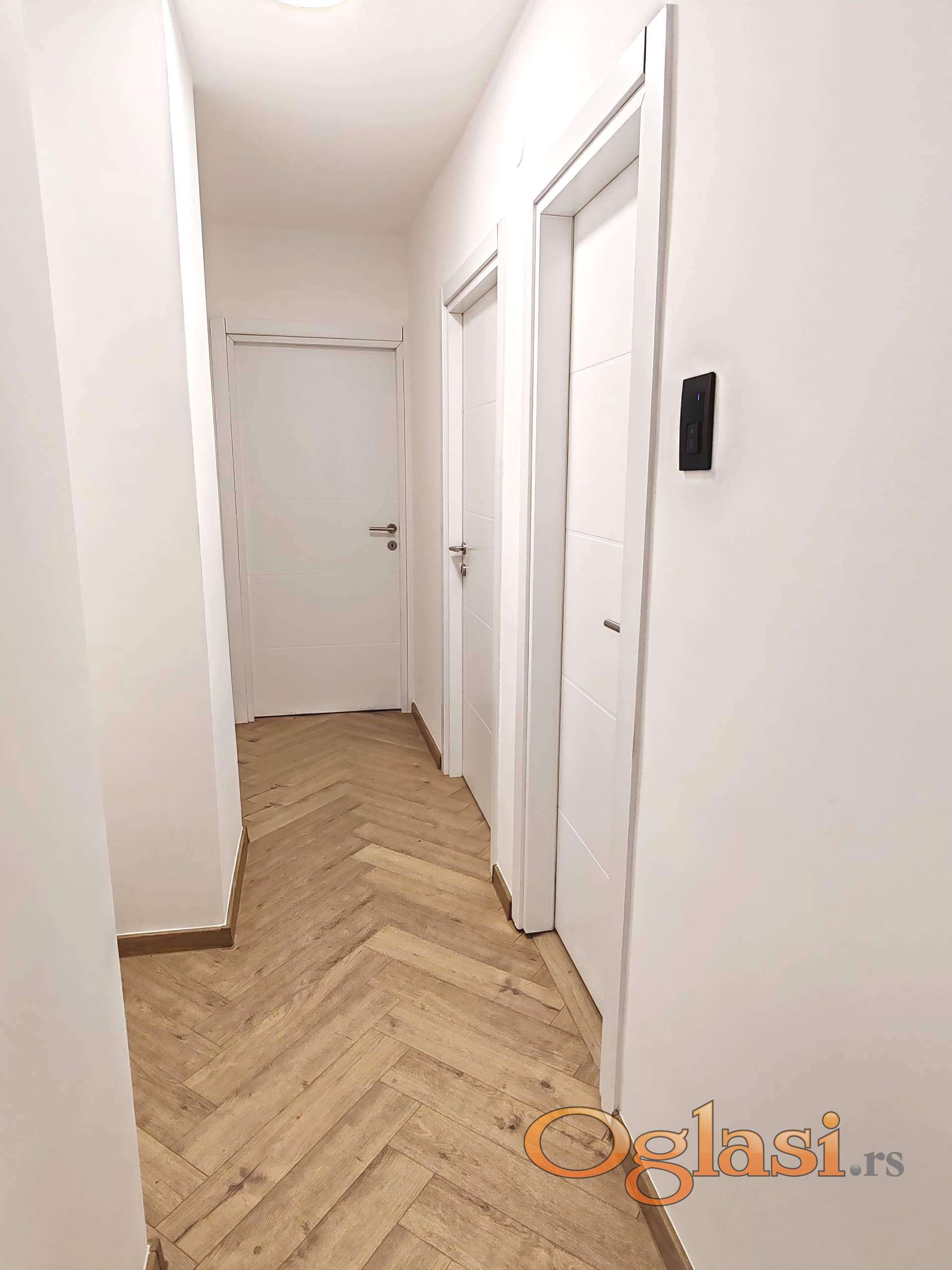 U stanu je praktično sve novo kupatilo i kuhinja u novoj kvalitetnoj keramici sa promenjenim instalacijama, novi parket visoke klase, nova spoljna PVC stolarija, kao i nova unutrašnja vrata u medijapanu i Sigurnosna vrata. Zidovi su sa kompletnim skidanjem do maltera obrađeni i izuzetno kvalitetno izgletovani do kvaliteta potpuno novog stana.