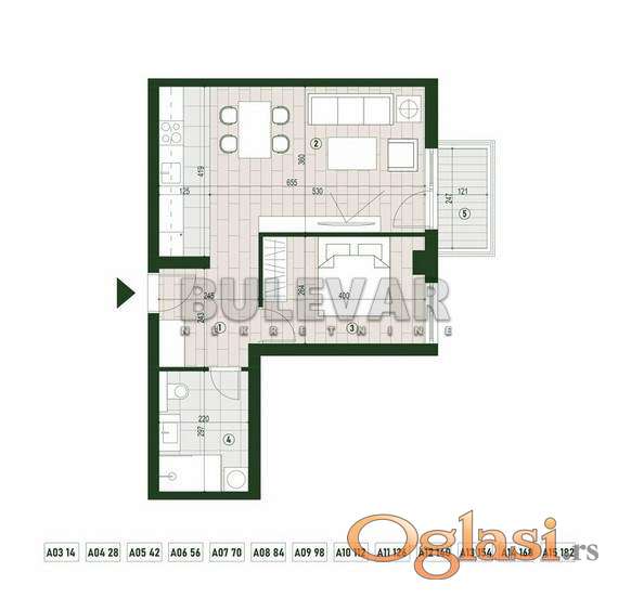 Struktura: ulazni hodnik dnevni boravak sa kuhinjom i trpezarijom spavaća soba kupatilo terasa Kvadrature i dostupnost: