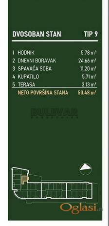 U ponudi je dvosoban stan u savremenom stambeno-poslovnom kompleksu koji čine tri lamele modernog arhitektonskog izraza: Lamela A – kula od 15 spratova sa 182 stana Lamela B – objekat od 10 spratova sa 72 stana Lamela C – objekat od 10 spratova sa 72 stana Kompleks je projektovan tako da budućim vlasnicima pruži moderan način života kroz spoj luksuza, funkcionalnosti i komfora, uz visok kvalitet gradnje i savremeni dizajn. Ukupno je planirano 326 stanova u 14 tipova sa različitim kvadraturama i varijantama.
