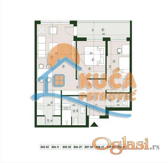 Struktura: ulazni hodnik dnevni boravak sa kuhinjom i trpezarijom dve spavaće sobe kupatilo toalet ostava terasa Kvadrature i dostupnost: