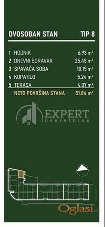 Lamela A – neto 51,84m² U ponudi 13 stanova od III do XV sprata. Cena: III sprat – 2.157,54 €/m² XV sprat – 2.460,26 €/m²