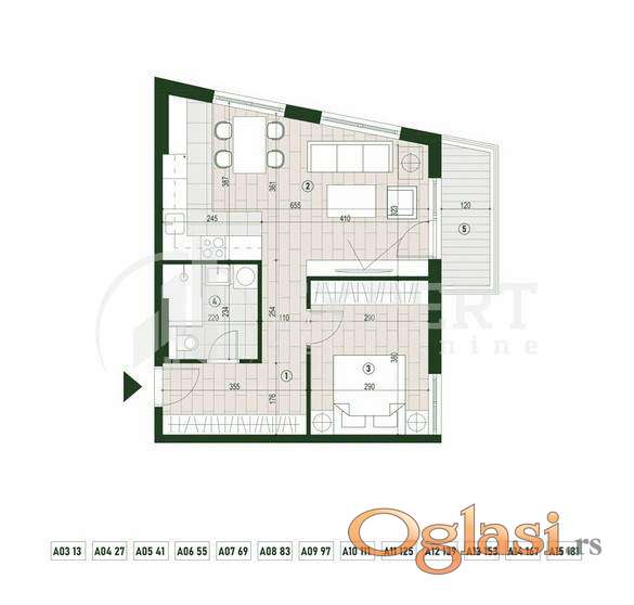Struktura: ulazni hodnik dnevni boravak sa kuhinjom i trpezarijom spavaća soba kupatilo terasa Kvadrature i dostupnost: