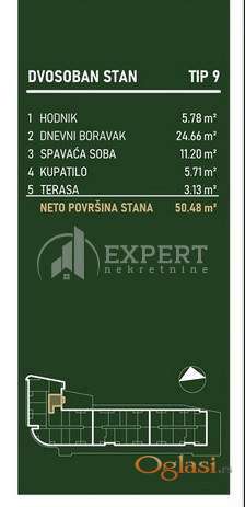 U ponudi je dvosoban stan u savremenom stambeno-poslovnom kompleksu koji čine tri lamele modernog arhitektonskog izraza: Lamela A – kula od 15 spratova sa 182 stana Lamela B – objekat od 10 spratova sa 72 stana Lamela C – objekat od 10 spratova sa 72 stana Kompleks je projektovan tako da budućim vlasnicima pruži moderan način života kroz spoj luksuza, funkcionalnosti i komfora, uz visok kvalitet gradnje i savremeni dizajn. Ukupno je planirano 326 stanova u 14 tipova sa različitim kvadraturama i varijantama.