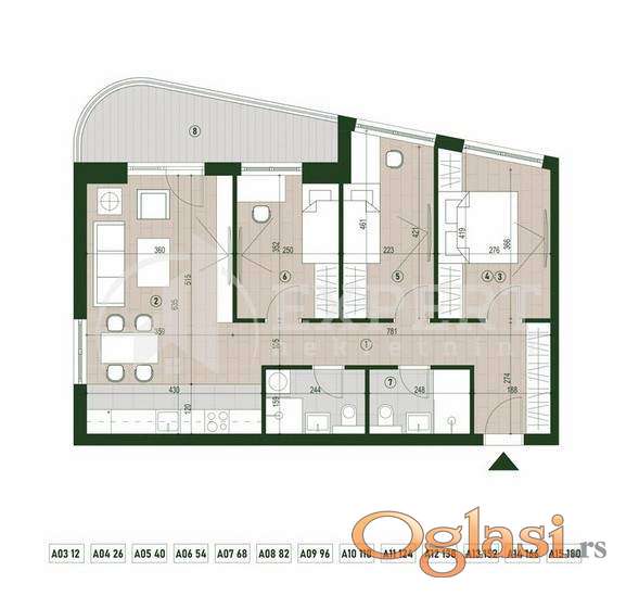 Struktura: ulazni hodnik dnevni boravak sa kuhinjom i trpezarijom tri spavaće sobe toalet kupatilo terasa Kvadrature i dostupnost:
