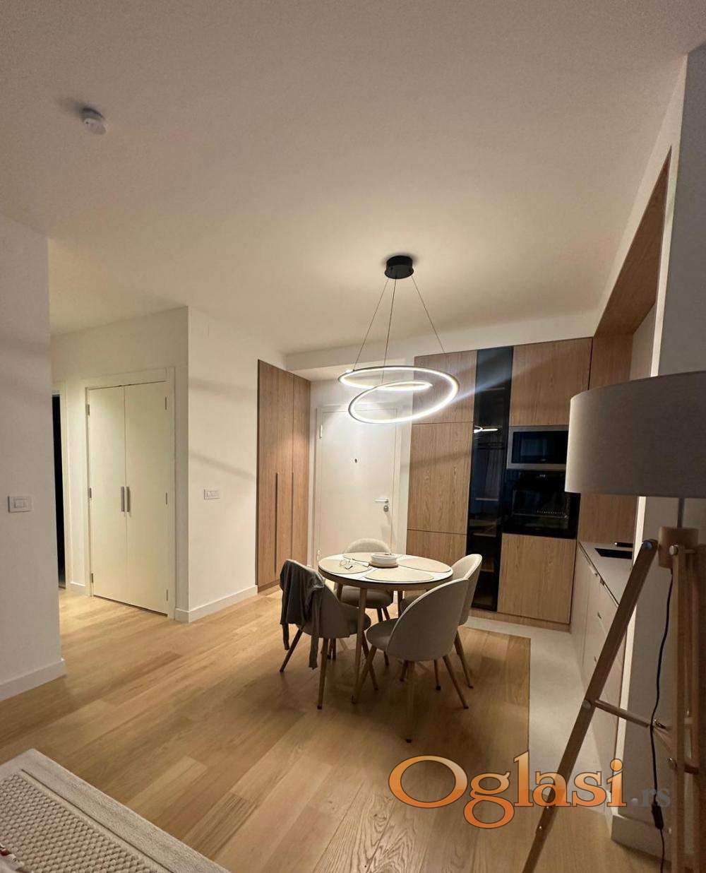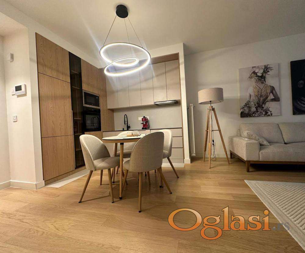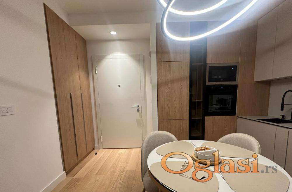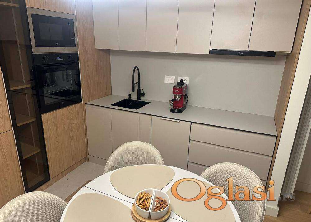 Nov, jugozapadno orijentisan, kompletno ekskuzivno opremljen trosoban stan (69m2 grejne + 5m2 terase) u zgradi Eterna;