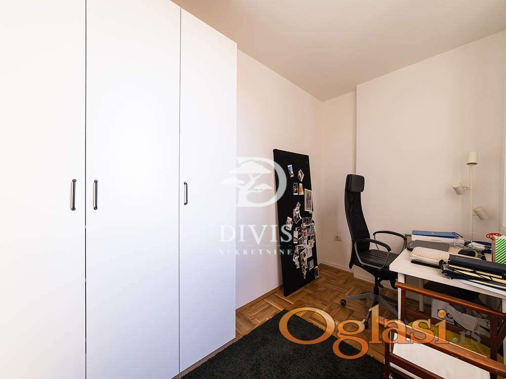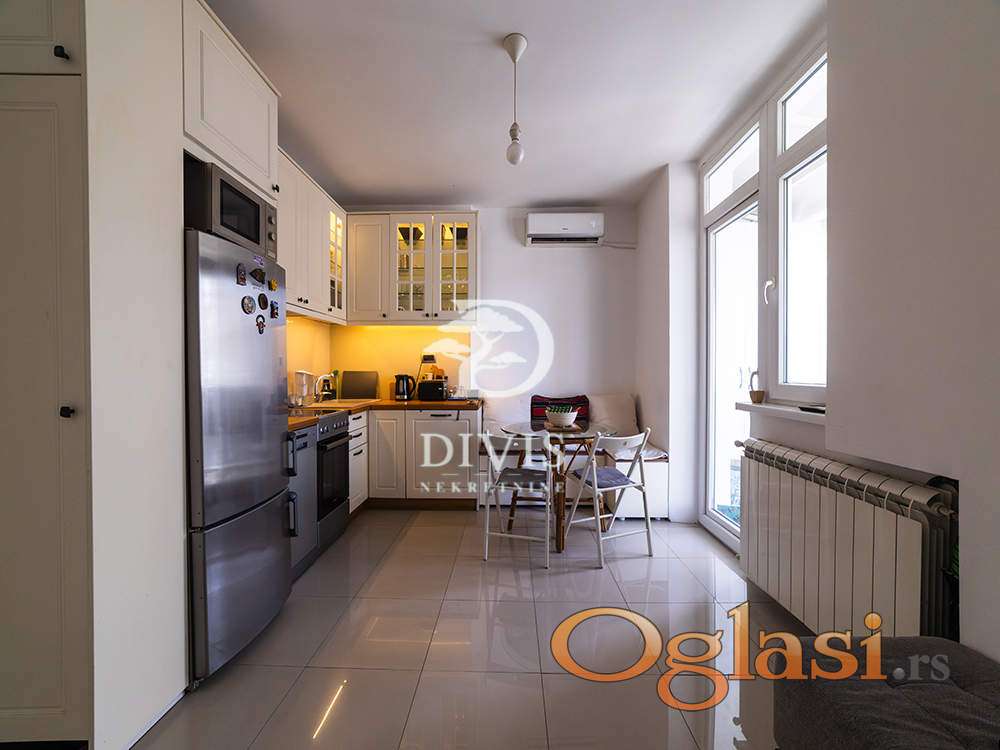 Prilikom renoviranja urađena je spoljna i unutrašnja termoizolacija, pažljivo je projektovan, korišćeni su kvalitetni materijali poput hrastovog parketa, Bosal sigurnosnih vrata, kvalitetne ugradne tehnike. Prodaje se namešten.
