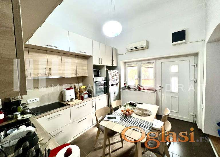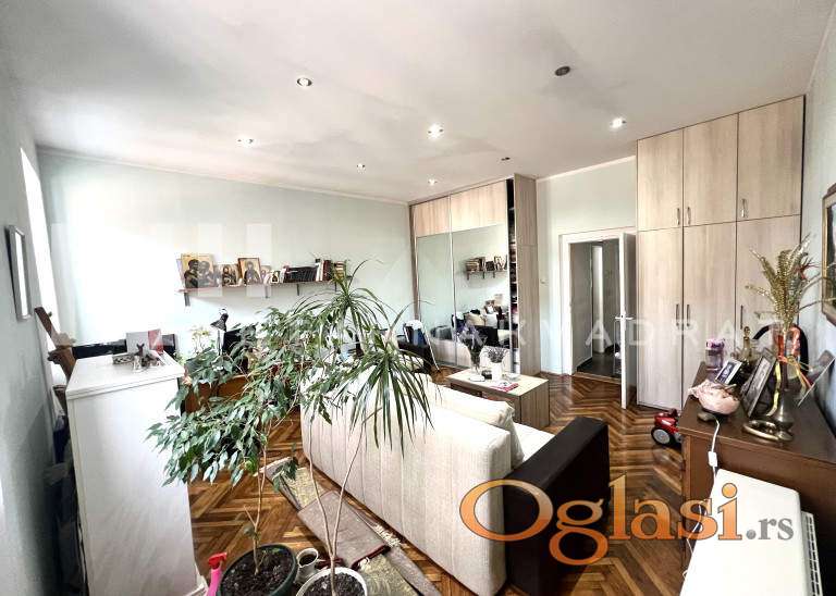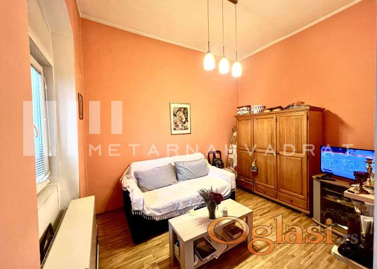 Nalazi se na prvom spratu i sastoji od dve sobe (jedna je veličine 25m2), kuhinjskog dela, kupatila i hodnika. Kompletno je renoviran i nisu potrebna dodatna ulaganja, osim po potrebi kupatila. Visina plafona je 3.5m i prodaje se bez nameštaja.