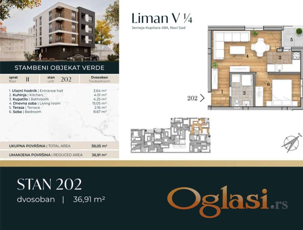 U ponudi agencije je odličan jednoiposoban stan u izgradnji vrhunskog Premium kvaliteta u ulici Jerneja Kopitara (popularna lokacija Liman 5) na svega nekoliko minuta hoda do Limana, Adamovićevog naselja, Telepa i drugih bitnih gradskih sadržaja.Stan se nalazi na 2/3 spratu zgrade sa liftom i sastoji se od ulaznog hodnika, dnevnog boravka sa kuhinjom, spavaće sobe, kupatila i terase.Iskazana cena je za parcijalno plaćanje koje podrazumeva uplatu 30% na predugovoru 30% kada zgrada dostigne 50 posto izgradjenosti 30% kada zgrada dostigne 75 posto izgradjenosti i 10 % na kljuc u ruke. Za avansnu uplatu cena je manja za 2000 e od navedene.Bez agencijske provizije! Ono sto je posebno interesantno za ovaj projekat je to sto investitor nudi otkup stana u koliko cena m2 po završetku objekta ne bude 200 e veća po m2. Za više informacija kontaktirati ALEX Nekretnine 063-50-11-20 Reg br 1640