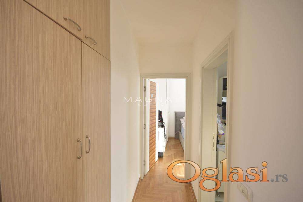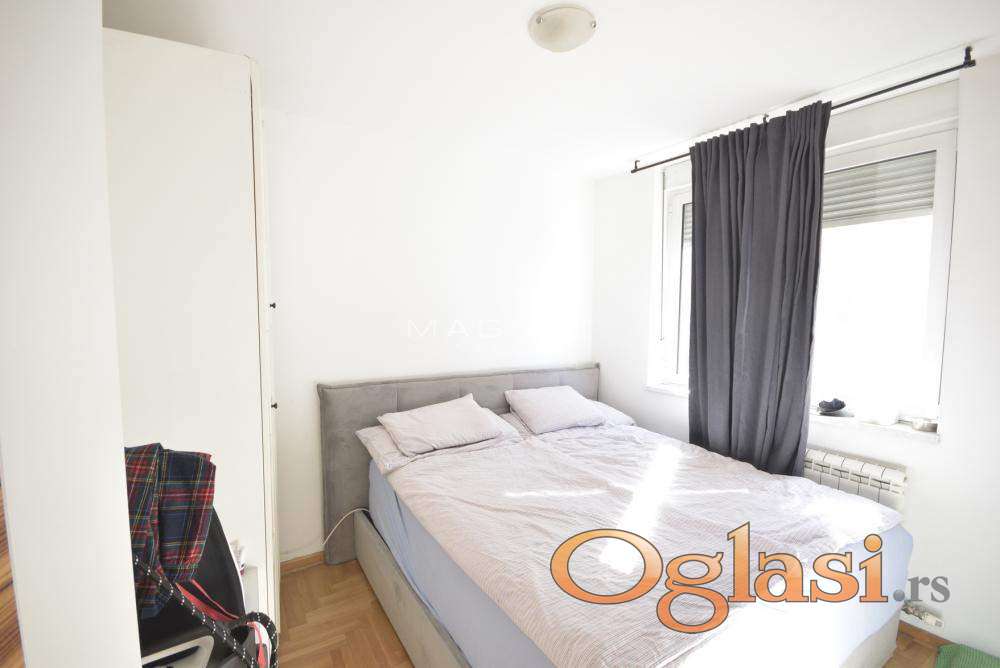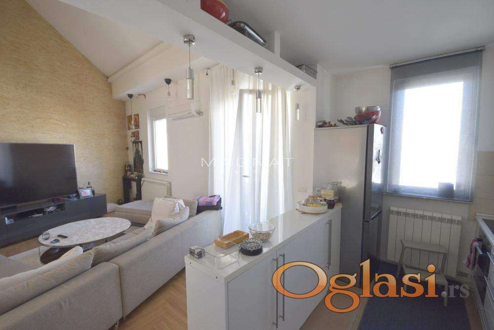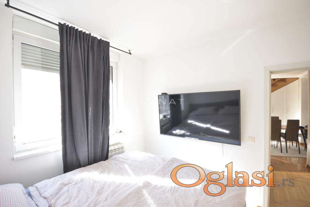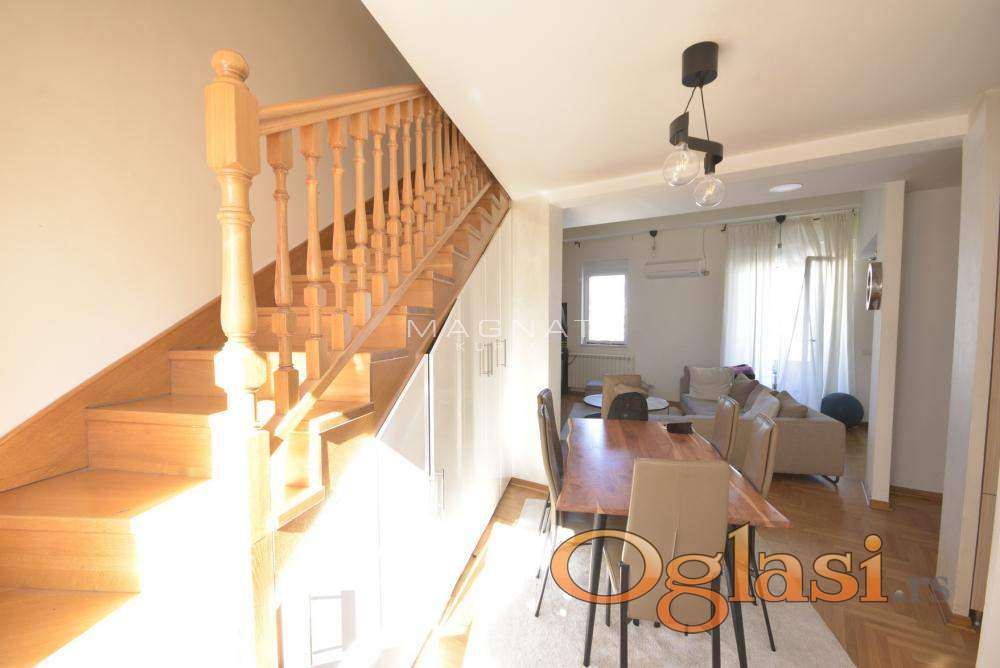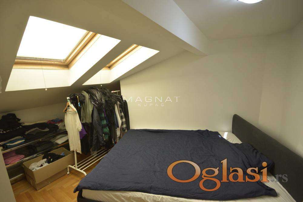 U zgradi novije gradnje sa liftom prodaje se stan na četvrtom spratu. Stan je u dva nivoa - duplex. Grejanje centralno sa kalorimetrima. U donjem delu sastoji se od komfornog dnevnog boravka sa trpezarijom i kuhinjom, terasom koja gleda na centar Beograda, spavaćom sobom i kupatilom Donji deo stana je 64,39m2. Na drugom nivou su tri sobe, predsoblje i kupatilo. Drugi nvo je u potkrovlju i ima kosine. Podna površina je u osnovi 52m2. Mogućnost kupovine garaže 13,5 m2 sa rolo vratima. 18 Oznaka na mapi pokazuje deo grada, ne i tačan položaj zgrade. Posrednička naknada 2%
