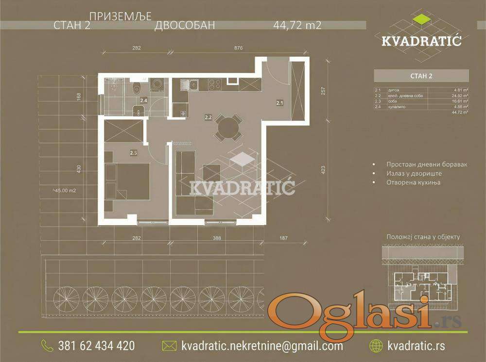 Stan ima 45m² i po strukturi je jednoiposoban. Nalazi se u kvalitetnoj novogradnji spratnosti P+2+Pk, građenoj od proverenih i kvalitetnih materijala. Posebnu pogodnost predstavlja pripadajuće dvorište, koje pruža dodatni komfor i privatnost.