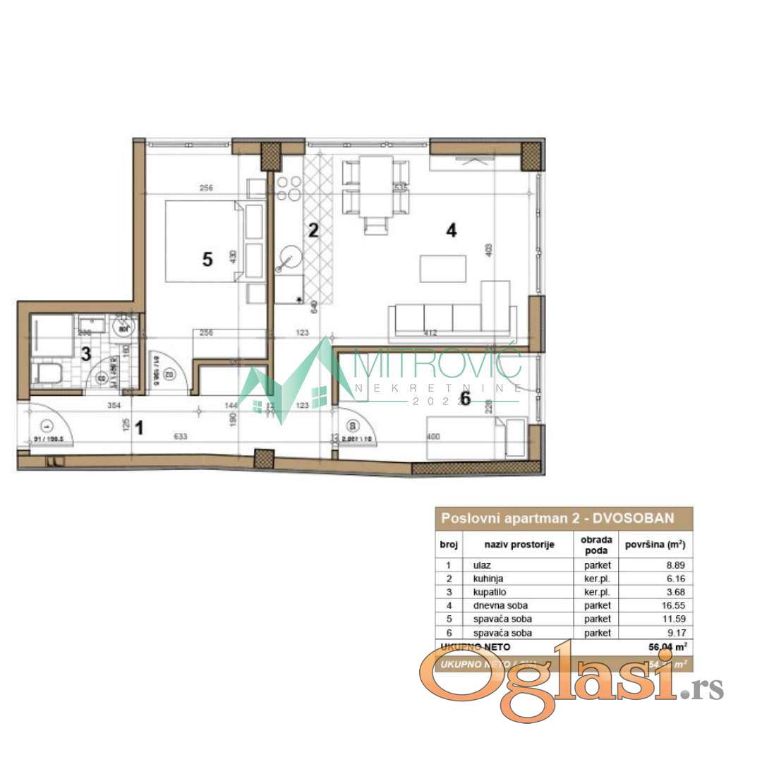 Predstavljamo vam savršenu priliku za kupovinu modernog dvosobnog poslovnog apartmana, koji se nalazi na galeriji elegantne zgrade. Pažljivo odabrani detalji čine ga idealnim za sofisticirane klijente koji traže udobnost i stil. Poslovni apartman se sastoji od dnevnog boravka, sa kuhinjom i trpezarijom, dve spavaće sobe i kupatila. Poslovni apartman će biti opremljen najnovijim trendovima u enterijeru, s fokusom na funkcionalnost i estetiku. Od podova do sanitarija, sve je pažljivo birano kako bi se postigao vrhunski kvalitet. Poslovni apartman se nalazi na atraktivnoj lokaciji, samo nekoliko minuta hoda od centra grada, što omogućava laku dostupnost svih sadržaja. Ovaj poslovni apartman je savršena investicija za one koji cene luksuz, udobnost i praktičnost. Ne propustite priliku da postanete vlasnik ovog izuzetnog stambenog prostora. Poslovni apartman je useljiv u junu 2026. godine. U cenu je uključena agencijska naknada u visini od 3%. Za više informacija obratite se na broj telefona: 0600800085.