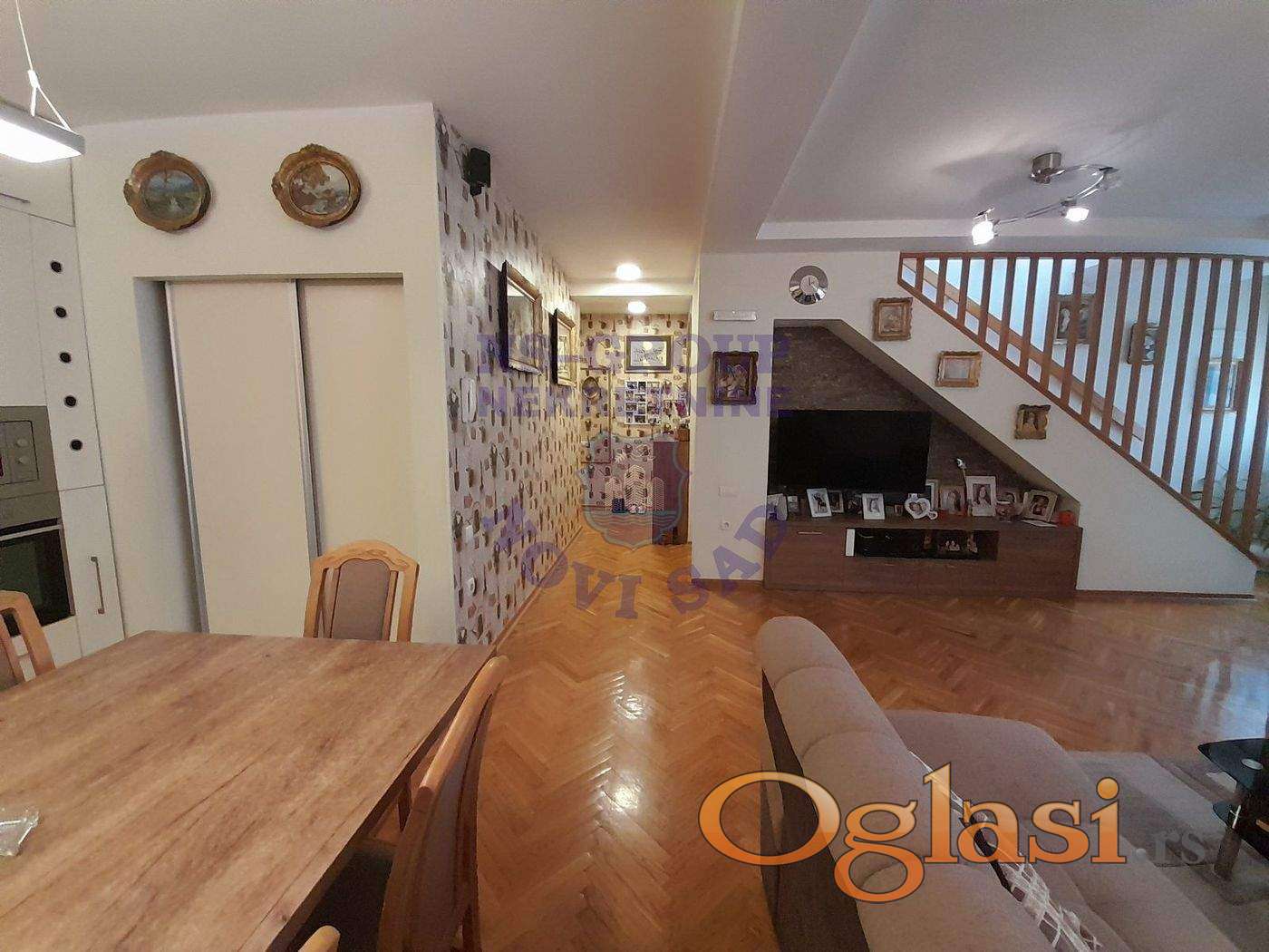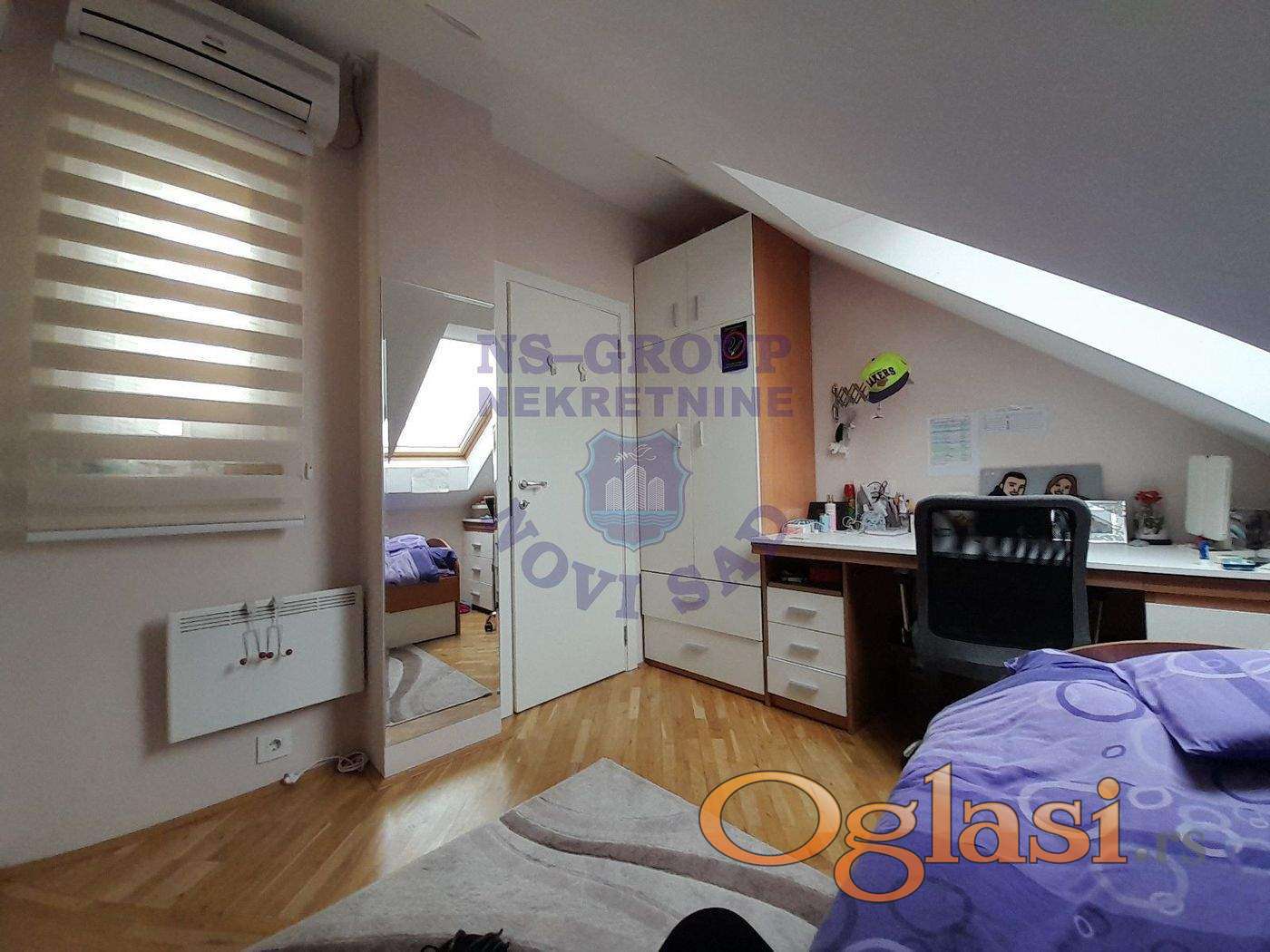 Idealno za porodicu sa malom decom. Parkingsa zelenilomispred i oko objekta.Mirna lokacija sa obdaništem,osnovnom i srednjom školom u neposrednoj blizini. Park sa sadržajem za decu na 50m od objekta. Blizu centra grada, Promenade,Futoške pijace, prodavnice. Ulazu dvorište sa kapijom sa daljinskim. Ulaz u objekat iz dvorišta, sa parking prostora. Zgrada unutra održavana,prošle godine okrečeni hodnici. Lift za 6 osoba. Stan istočno orijentisan ka dvorištu, bez dodatnih ulaganja,kao nov. Renoviran i adaptiran spram sopstvenih potreba u višem kvalitetu pre 2 godine. Visina do plafona višlja od standarne. Stanu pripada ostava u nivou stanas, u hodniku, pripada ostava u podrumu. Raspoloživost biciklane u okviru objekta. Klimatizovano sa 4 klima uredjaja. Fasadni zidovi izolovani - sendvić zid, bok 25 cm + izolacija+ opeka 12 cm. Petosoban stan u tri nivoa, prvi nivo veliki dn.boravak sa trpezarijom i kuhinjom, široka i duga terasa, ostava i toalet sa tuš kabinom. Drugi nivo master kupatilao sa velikom ugaonom kadom i dve sobe odvojene amerićkim plakarima sa klasičnim prozorima i četvorostrukim VELUX krovnim prozorima redovno održavanim. Treći nivo dve sobe sa velikim klasičnim i krovnim VElLUX prozorima, nivoi povezani sa betonskim stepeništem. Odmah useljivo. Mogućnost kupovine garaže sa posebnim vodomerom i strujomerom u sklopu objekta u prizemlju beličine 23 m2. Mogućnost prodaje sa ugradnim nameštajem uz nadoknadu, kuhinja i plakari kao novi.
