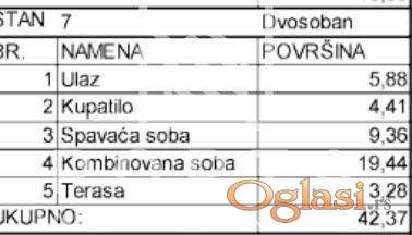 Stan dvosoban,42.37m2 nalazi se na 1 spratu u novoj zgradi sa liftom i sastoji se iz hodnika,dnevne sobe sa trpezarijom i kuhinjom, spavaće sobe,kupatila i lepe terase.