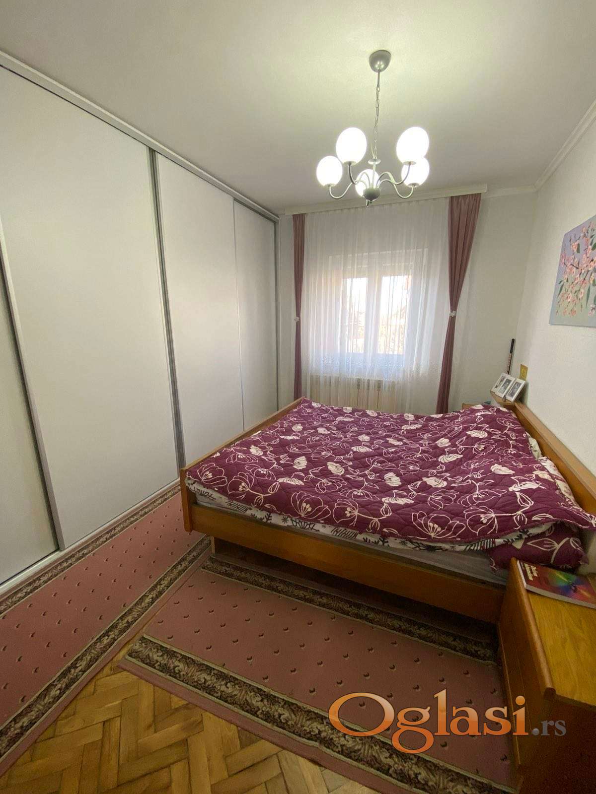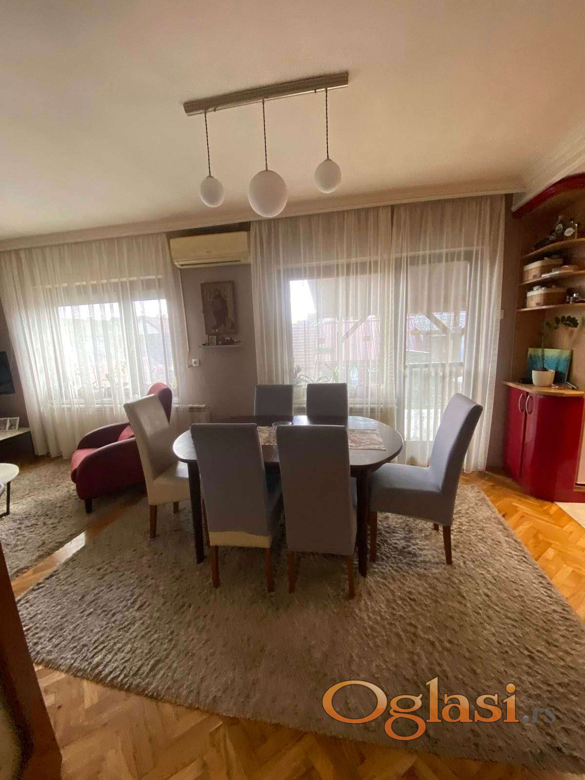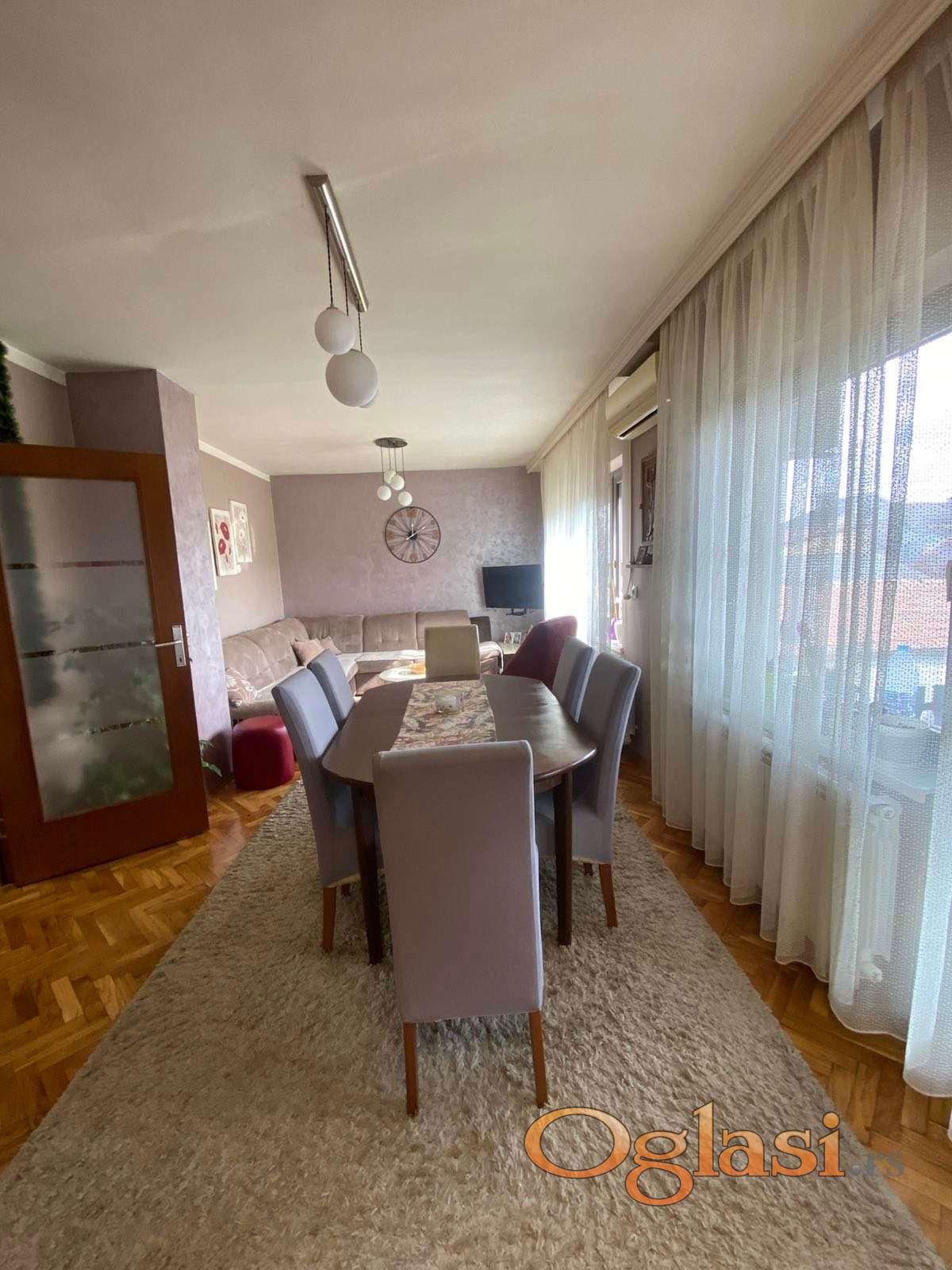 U stan se ulazi kroz veliki hodnik koji vodi do tri spavace sobe, kupatila, dnevnog boravaka sa trpezarijom i kuhinjom. Sav namestaj je ocuvan i nov, kao i parketi i stolarija.