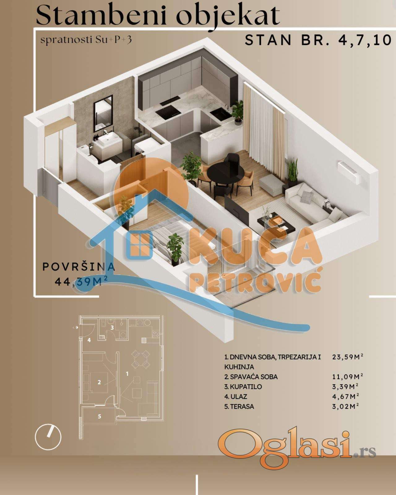 Stan je projektovane površine 44,39m2, nalazi se na prvom spratu u objektu sa liftom.