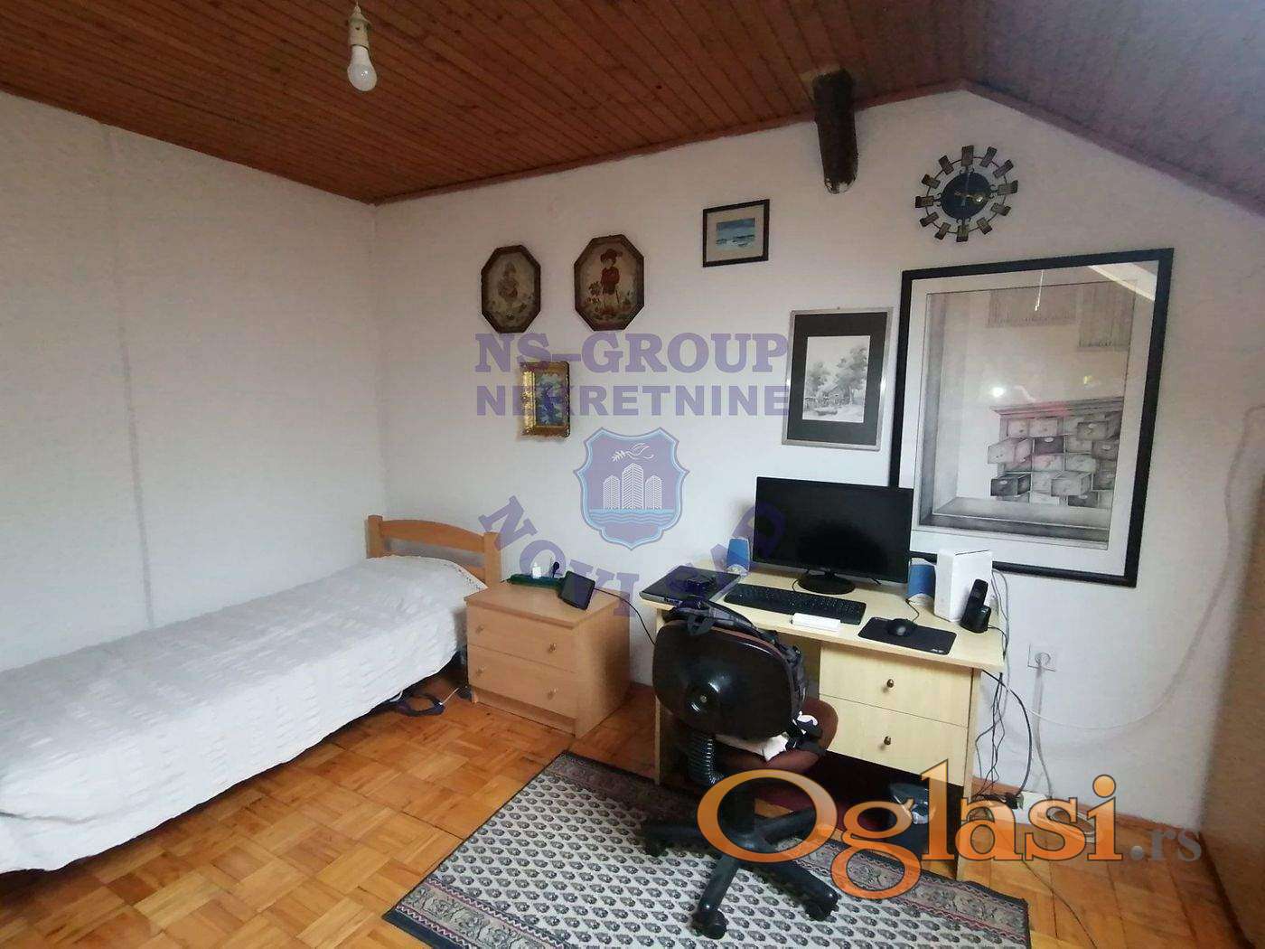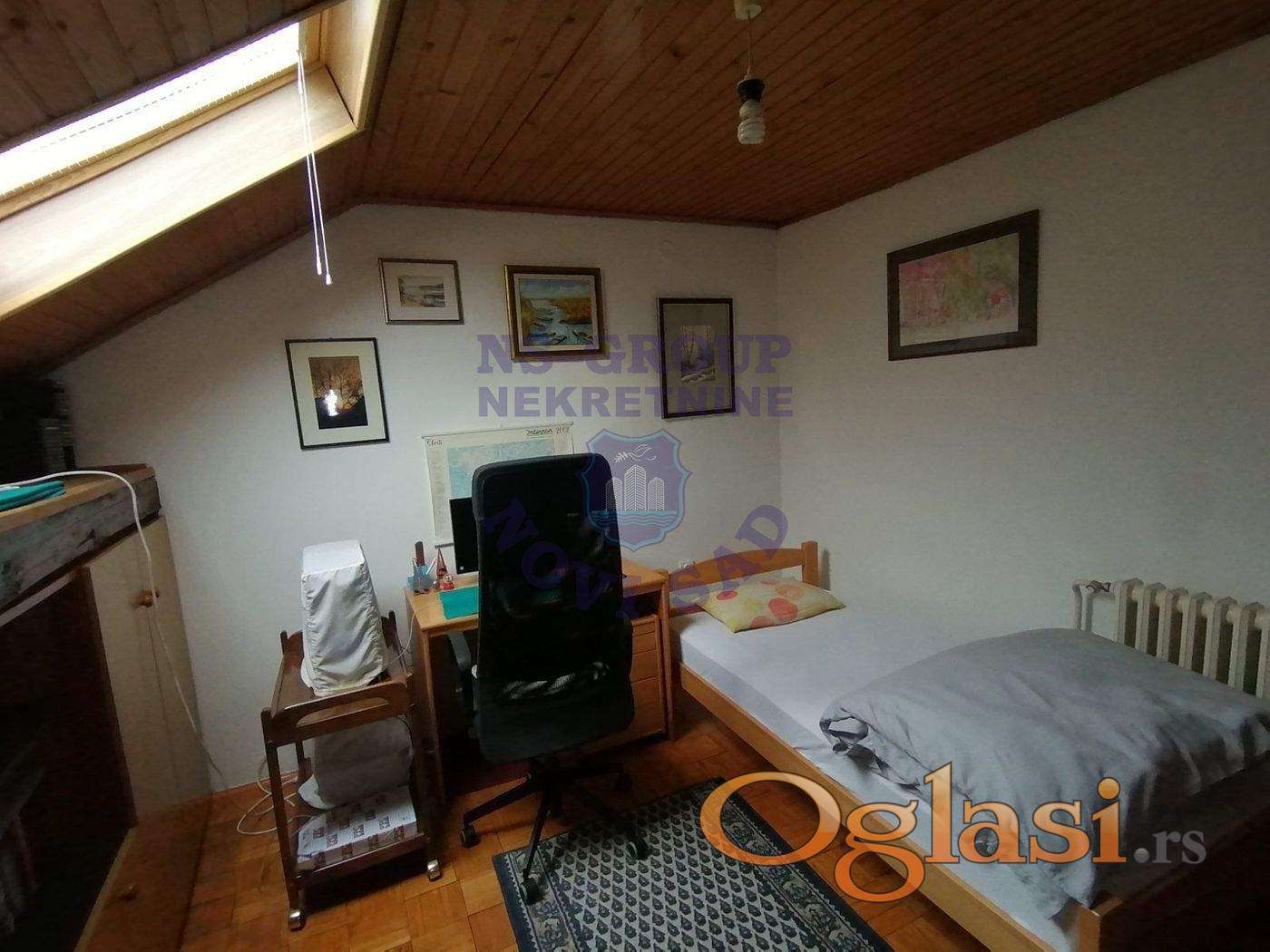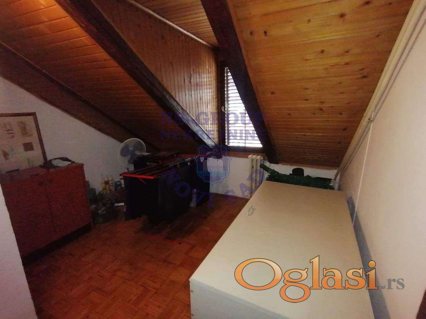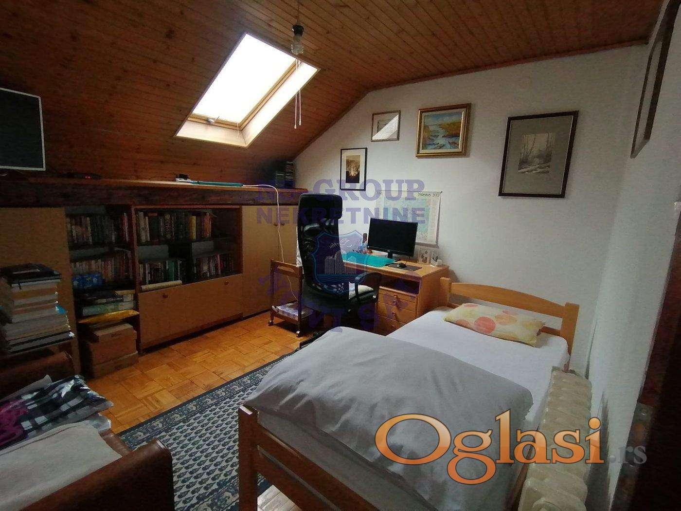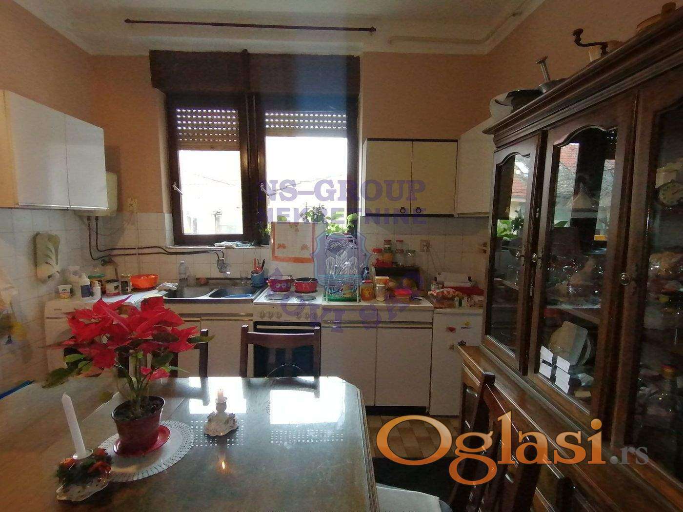Komforan četvorosoban stan, dvostrano orijentisan (ulica i dvorište), prizemlje i potkrovlje: četiri sobe, predsoblje, odvojena kuhinja sa trpezarijom, dva kupatila i WC-a, ulaz, hodnik i ostava. Objekat je pogodan i za poslovni prostor. Može se pretvoriti u pet kancelarija ili lokal i četiri kancelarije. Uknjižen. Poseban ulaz u stan – iz pasaža. Kolski ulaz u dvorište. Etažno grejanje na gas, dve klime, telefon, priključci za kablovsku TV i internet. Ukupna površina 98 m2, plus zidana šupa i parking mesto u dvorištu. Moguć svaki dogovor i korekcija cene.