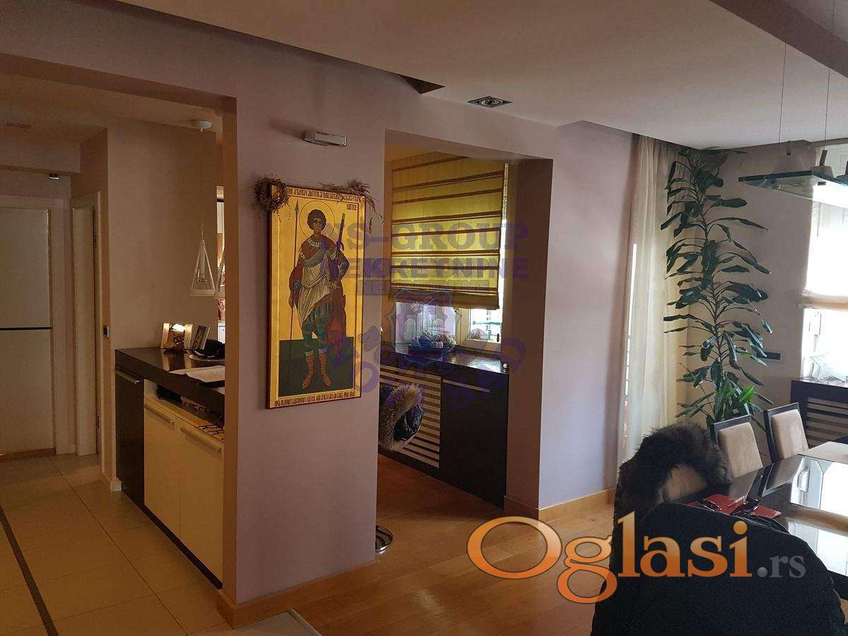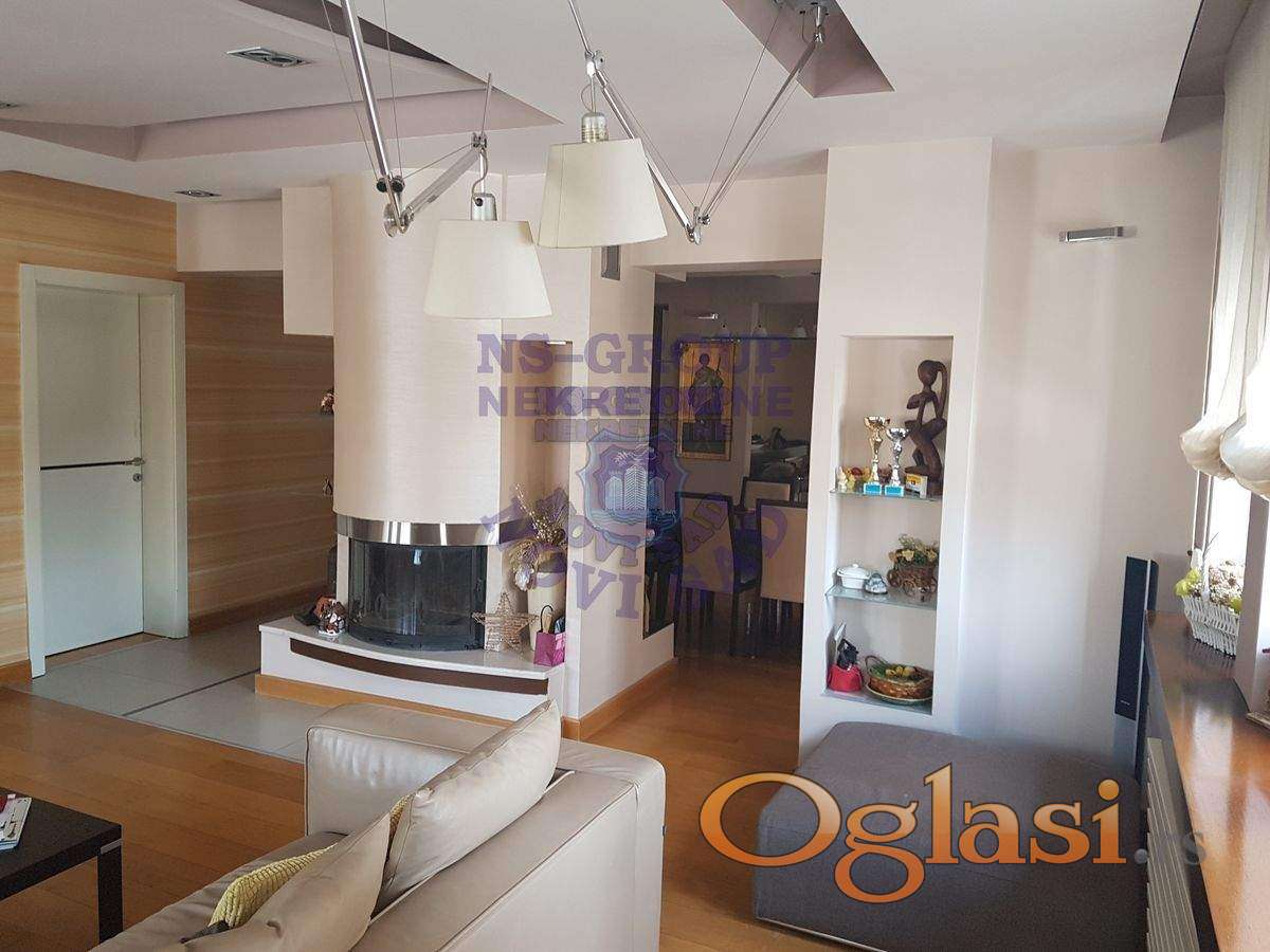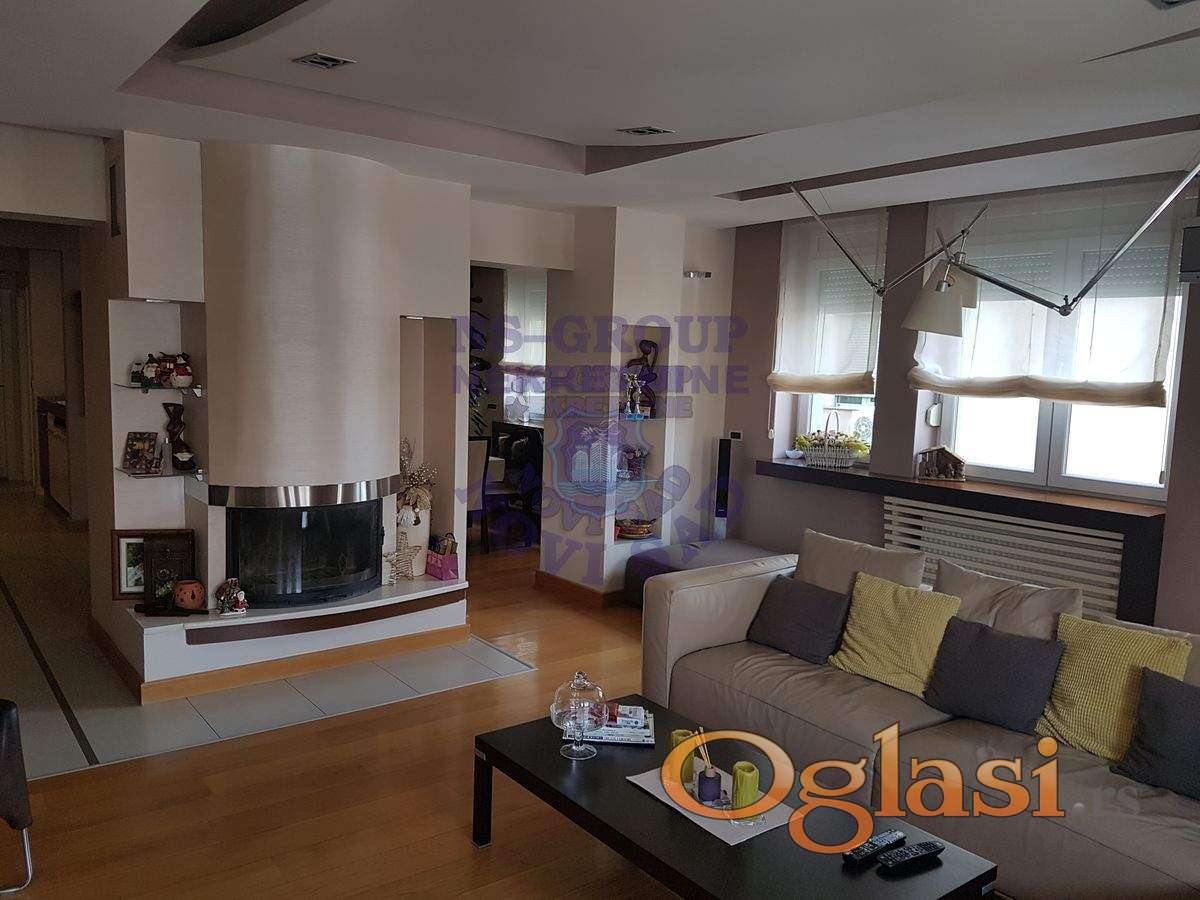 Prelep 4,0 stan, koji su sadašnji vlasnici uzeli u sirovom stanju-sve je namenski odrađeno !! Odlična keramika, kamin u dn.boravku. Zauzima skoro 1/2 cele etaže, u ceni ostaje kompletan i izuzetan nameštaj sa svom tehnikom, plakari, jakuzzi u velikom kupatilu. U dvorištu prizemne garaže sa rolo vratima, koje se posebno prodaju, ali nije uslov !!
