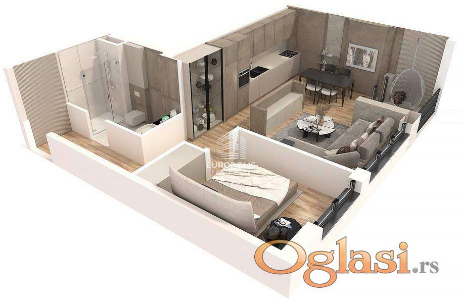 Raspored:hodnik, toalet, dnevna sa kuhinjom i trpezarijom, kupatilo, soba, terasa.