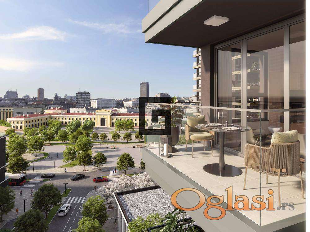 Stan je istočno orijentisan, sa otvorenim pogledom ka Savski trg i panorami grada, u neposrednoj blizini pešačke promenade uz reku.
