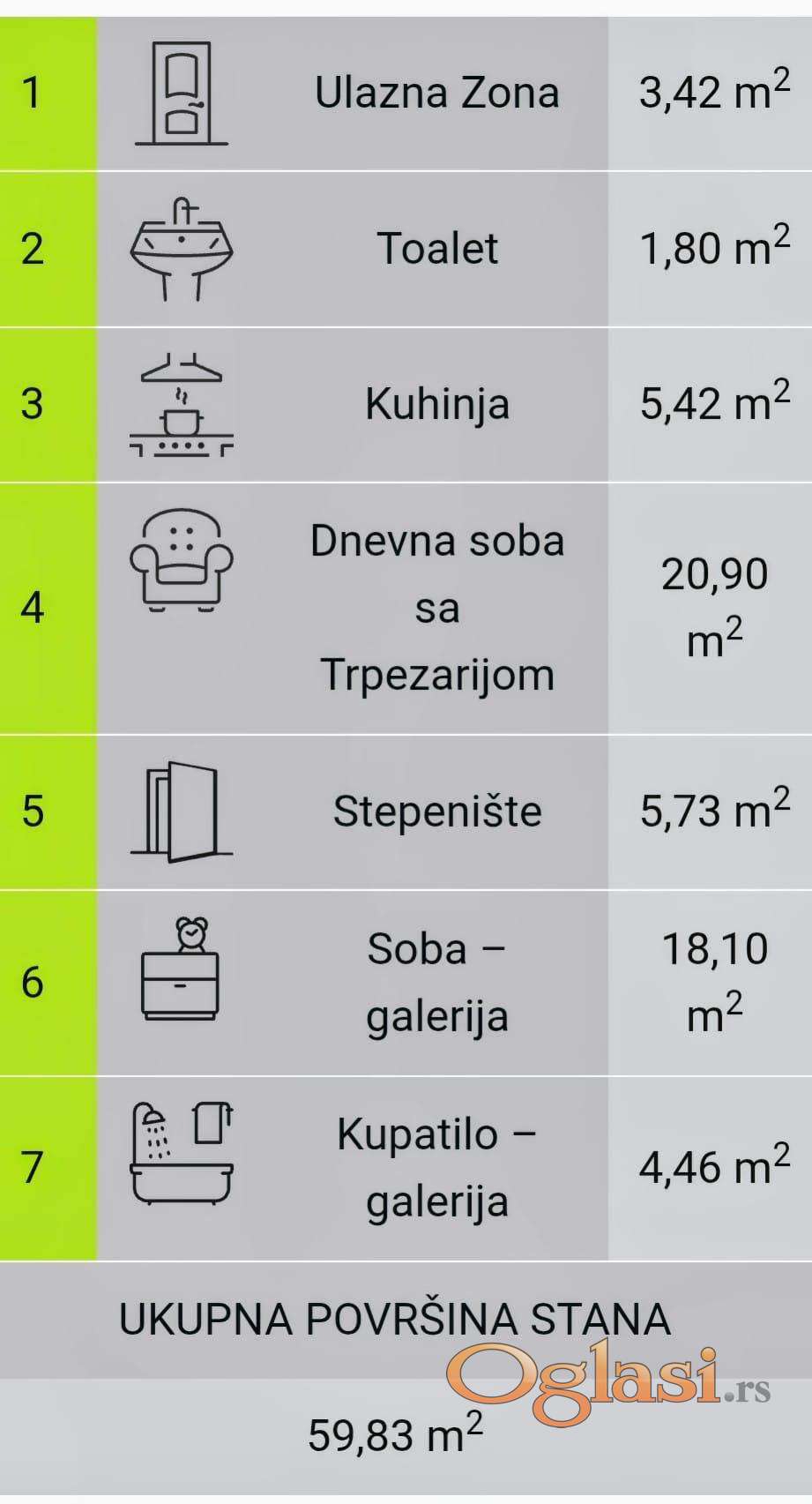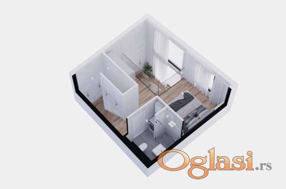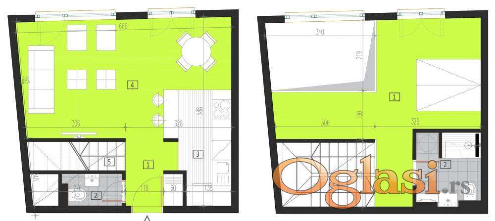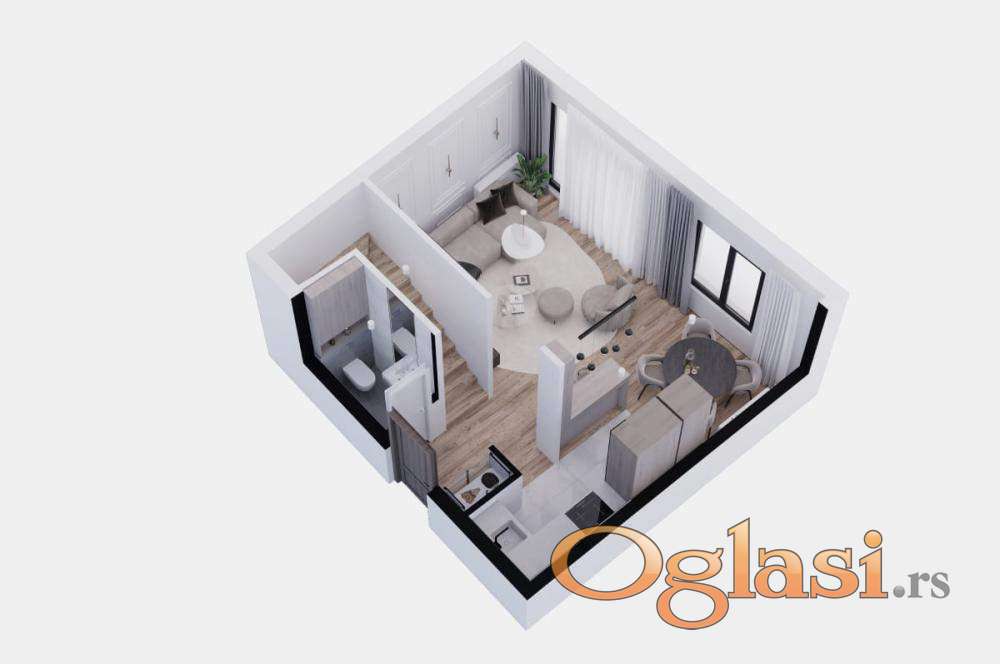 Sastoji se od dnevne sobe, kuhinje i toaleta u donjem delu.