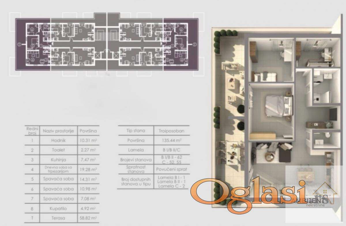 Ima 135m2 i čine ga dnevna soba sa kuhinjom i trpezarijom,tri spavaće sobe, kupatilo, wc i terasa.