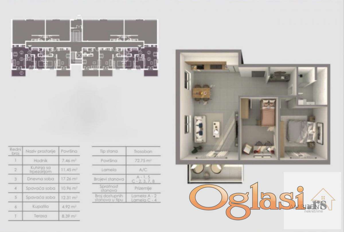 Ima 73m2 i čine ga dnevna soba, kuhinja i trpezarijom,dve spavaće sobe, kupatilo i terasa.